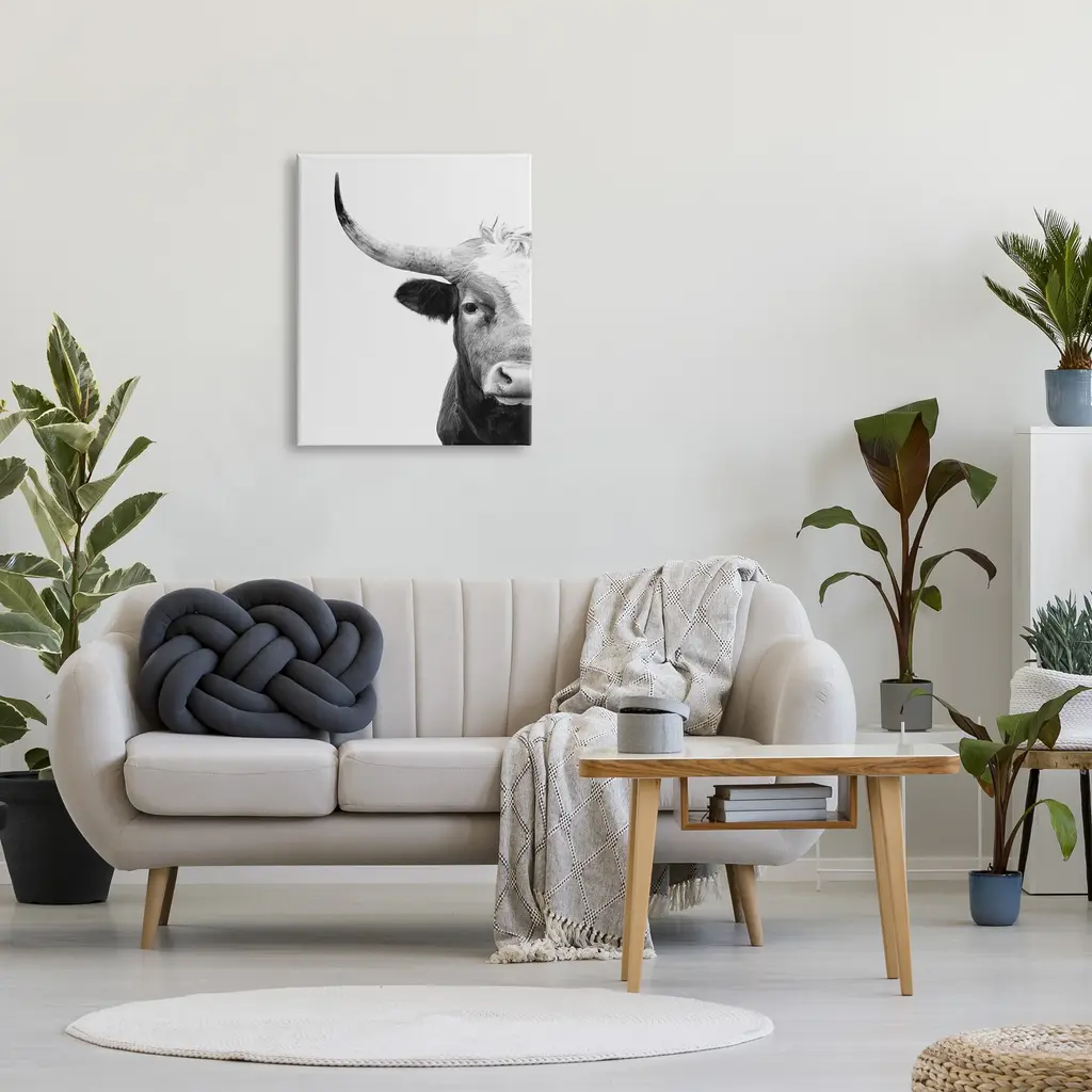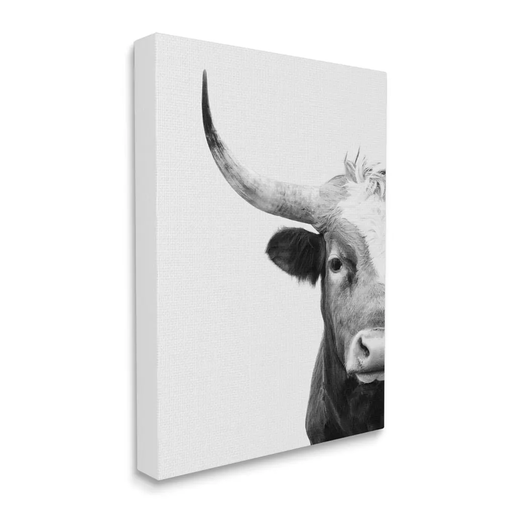 We create our stretched canvas to the highest standards. Using only the highest quality inks and canvas on Mimaki printers, we hand-cut and stretch each piece over a 1.5-inch thick wooden frame for hanging. As a result, the art comes ready to hang on the sturdy ledge with no installation required. Stupell Wall Art is made in the USA.Features: Dimensions: 16 x 1.5 x 20 InchesStretched Canvas Sizes Include Standard: 16 x 1.5 x 20 Large: 20 x 1.5 x 30 X-Large: 30 x 1.5 x 40 Oversized: 36 x 1.5 x 48Wall Art is Ready to Hang with Hardware Free Hanging. No installation required. For Easy Set Up Lean or Layer Artwork on Shelf or Against Wall.Our stretched canvas is created with the highest standards. We use only the highest quality inks and canvas on our in house Mimaki printers, and then hand cut and stretch each piece over a 1.5 inch thick wooden frame for hanging. Made In USA.Artwork Relates To: Animal, Bull, Mammal, Cattle, Longhorn, PortraitDesign by Sisi and Seb