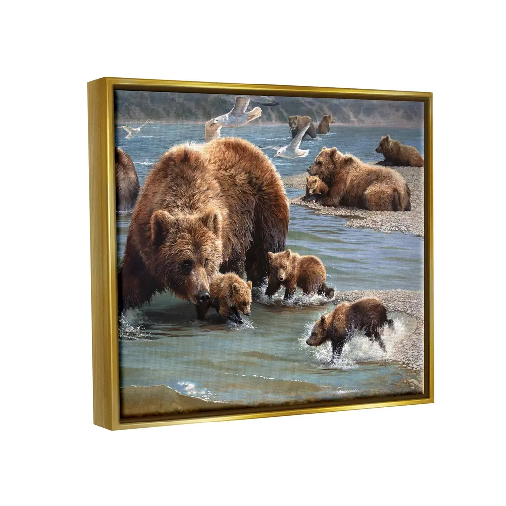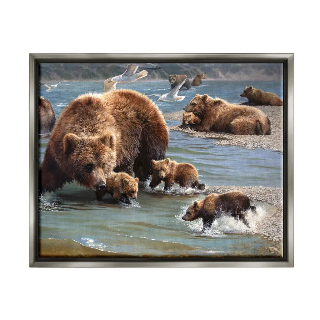 Stupell Grizzly Bear Family Fishing Framed Floater Canvas Wall Art By Bonnie Marris - 30 X 24 - Grey