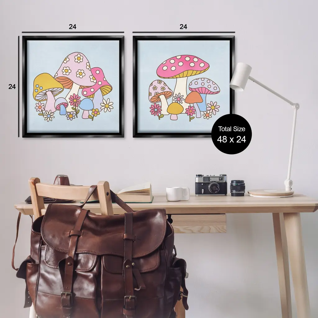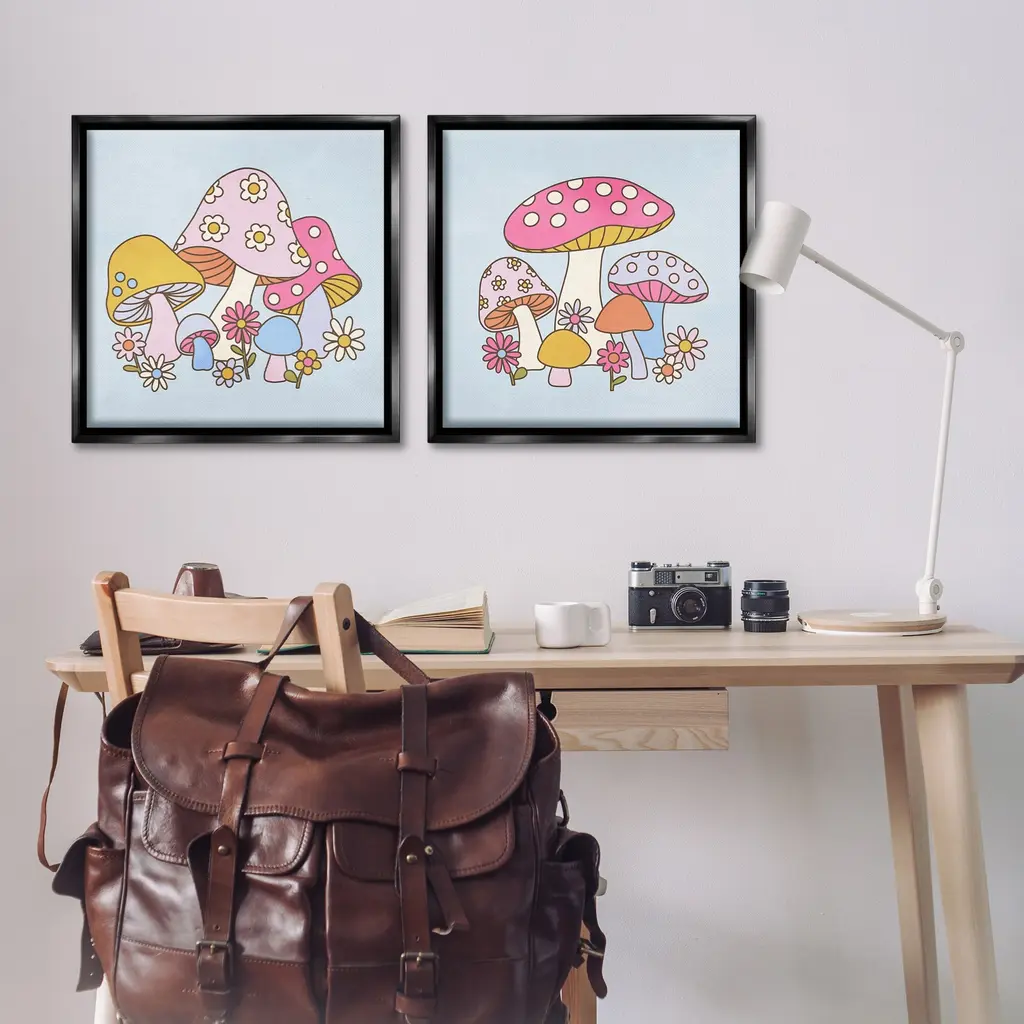 Elevate your home or office to the next level with Stupell Framed Floating Canvas Wall Art. Our premium hand-stretched canvas is mounted securely into a sturdy lightweight frame. The museum-style gap between the wrapped canvas and the box frame gives the illusion of floating artwork. Stupell Wall Art is made in the USA.Features: Dimensions: 2 Piece Set, Each Frame is 18 x 1.7 x 18Two Piece Floating Frame Canvas Products are available as 18"x18" or 25"x25" Panels. All Floating Frame Canvas Products have a 1.7" Depth.Wall Art is Ready to Hang with Hardware Free Hanging. No Installation required. For Easy Set Up Lean or Layer Artwork on Shelf or Against Wall. Artwork is Permently Fixed into the Frame.Our elevated 1.7" Thick Floating Frame is the perfect complement to our canvas style Wall Art. We use only the highest quality inks in house with industry leading printing solutions. Canvas is hand stretched over a durable wood foundation and then mounted securly into a Modern Box Frame. Made in the USA.Artwork Relates To: Agaric, Fungus, Mushroom, Plant, Retro, Groovy, Floral, FlowerDesign by Victoria Barnes