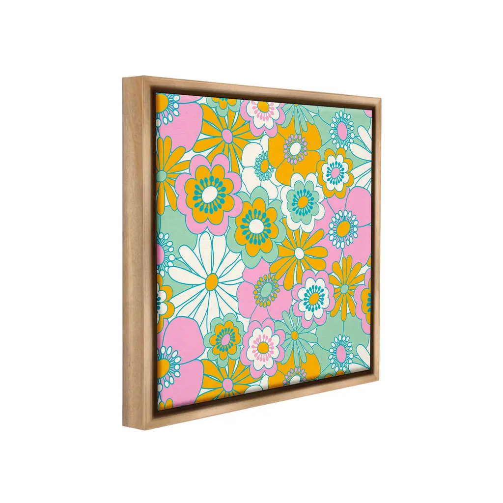 Elevate your home or office to the next level with Stupell Framed Floating Canvas Wall Art. Our premium hand-stretched canvas is mounted securely into a sturdy lightweight frame. The museum-style gap between the wrapped canvas and the box frame gives the illusion of floating artwork. Stupell Wall Art is made in the USA.Features: Dimensions: 18 x 1.7 x 18 Frame, 17 x 1.5 x 17 Canvas ArtFloating Frame Canvas Products are available in sizes 18"x18" and 25"x25". All Floating Frame Canvas Products have a 1.7" Depth.Wall Art is Ready to Hang with Hardware Free Hanging. No Installation required. For Easy Set Up Lean or Layer Artwork on Shelf or Against Wall. Artwork is Permently Fixed into the Frame.Our elevated 1.7" Thick Floating Frame is the perfect complement to our canvas style Wall Art. We use only the highest quality inks in house with industry leading printing solutions. Canvas is hand stretched over a durable wood foundation and then mounted securly into a Modern Box Frame. Made in the USA.Artwork Relates To: Pattern, Floral, Daisy, Flower, Plant, Groovy, Retro, ModernDesign by Carrie Cantwell