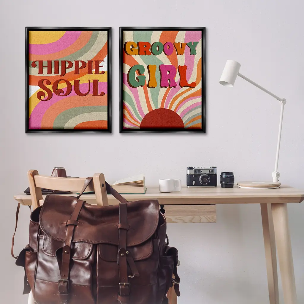 Elevate your home or office to the next level with Stupell Framed Floating Canvas Wall Art. Our premium hand-stretched canvas is mounted securely into a sturdy lightweight frame. The museum-style gap between the wrapped canvas and the box frame gives the illusion of floating artwork. Stupell Wall Art is made in the USA.Features: Dimensions: 2 Piece Set, Each Frame is 17 x 1.7 x 21Two Piece Floater Framed Canvas are available as 17x21 or 25x31 Panels. All Floater Frame Products have a 1.7" Depth.Wall Art is Ready to Hang with Hardware Free Hanging. No Installation required. For Easy Set Up Lean or Layer Artwork on Shelf or Against Wall. Artwork is Permently Fixed into the Frame.Our elevated 1.7" Thick Floating Frame is the perfect complement to our canvas style Wall Art. We use only the highest quality inks in house with industry leading printing solutions. Canvas is hand stretched over a durable wood foundation and then mounted securly into a Modern Box Frame. Made in the USA.Artwork Relates To: Pattern, Stripes, Sun, Waves, Rays, Groovy, Retro, Hippie Soul, Groovy GirlDesign by Regina Moore