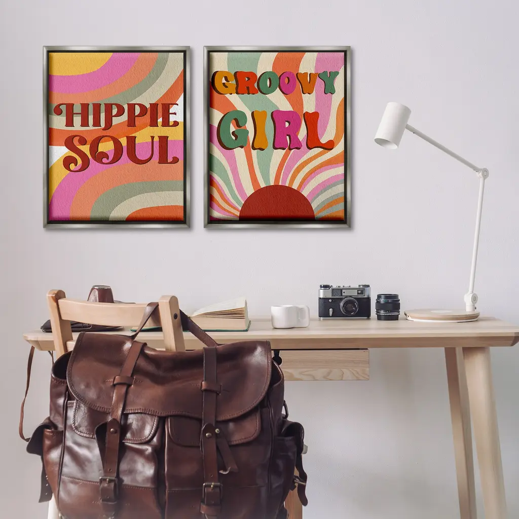 Elevate your home or office to the next level with Stupell Framed Floating Canvas Wall Art. Our premium hand-stretched canvas is mounted securely into a sturdy lightweight frame. The museum-style gap between the wrapped canvas and the box frame gives the illusion of floating artwork. Stupell Wall Art is made in the USA.Features: Dimensions: 2 Piece Set, Each Frame is 17 x 1.7 x 21Two Piece Floater Framed Canvas are available as 17x21 or 25x31 Panels. All Floater Frame Products have a 1.7" Depth.Wall Art is Ready to Hang with Hardware Free Hanging. No Installation required. For Easy Set Up Lean or Layer Artwork on Shelf or Against Wall. Artwork is Permently Fixed into the Frame.Our elevated 1.7" Thick Floating Frame is the perfect complement to our canvas style Wall Art. We use only the highest quality inks in house with industry leading printing solutions. Canvas is hand stretched over a durable wood foundation and then mounted securly into a Modern Box Frame. Made in the USA.Artwork Relates To: Pattern, Stripes, Sun, Waves, Rays, Groovy, Retro, Hippie Soul, Groovy GirlDesign by Regina Moore