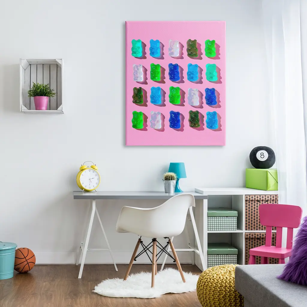 We create our stretched canvas to the highest standards. Using only the highest quality inks and canvas on Mimaki printers, we hand-cut and stretch each piece over a 1.5-inch thick wooden frame for hanging. As a result, the art comes ready to hang on the sturdy ledge with no installation required. Stupell Wall Art is made in the USA.Features: Dimensions: 16 x 1.5 x 20 InchesStretched Canvas Sizes Include Standard: 16 x 1.5 x 20 Large: 20 x 1.5 x 30 X-Large: 30 x 1.5 x 40 Oversized: 36 x 1.5 x 48Wall Art is Ready to Hang with Hardware Free Hanging. No installation required. For Easy Set Up Lean or Layer Artwork on Shelf or Against Wall.Our stretched canvas is created with the highest standards. We use only the highest quality inks and canvas on our in house Mimaki printers, and then hand cut and stretch each piece over a 1.5 inch thick wooden frame for hanging. Made In USA.Artwork Relates To: Food, Candy, Gummy Bear, PinkDesign by Lil' Rue