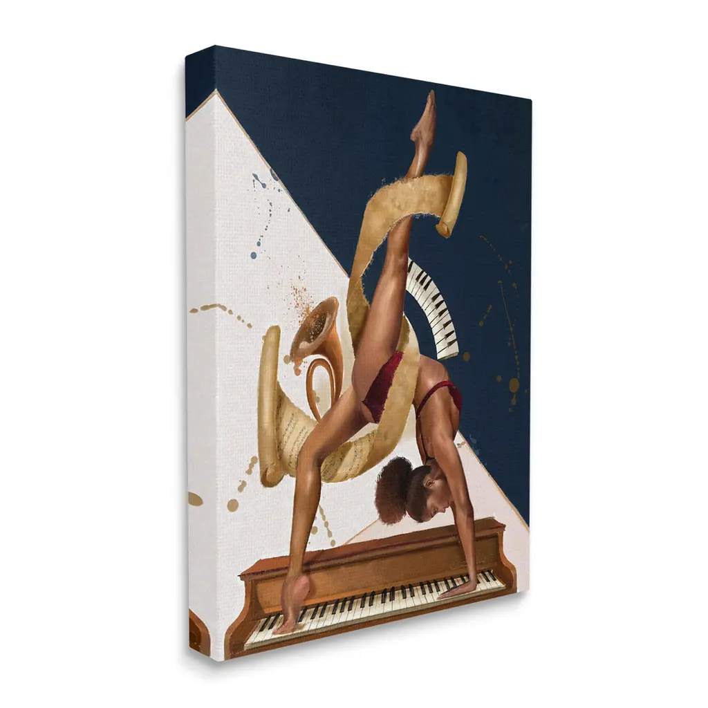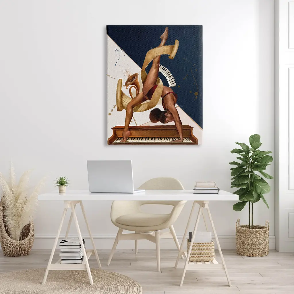 Proudly made in the USA, Our stretched canvas is created with the highest standards. We use only the highest quality inks and canvas on our in house Mimaki printers, and then hand cut and stretch each piece over a 1.5 inch thick wooden frame for hanging. The art comes ready to hang with no installation required.Features: Dimensions: 16 x 1.5 x 20 InchesStretched Canvas Sizes Include Standard: 16 x 1.5 x 20 Large: 20 x 1.5 x 30 X-Large: 30 x 1.5 x 40 Oversized: 36 x 1.5 x 48Wall Art is Ready to Hang - No Installation or Hardware Needed. For Easy Set Up Lean or Layer Artwork on Shelf or Against Wall.Our stretched canvas is created with the highest standards. We use only the highest quality inks and canvas on our in house Mimaki printers, and then hand cut and stretch each piece over a 1.5 inch thick wooden frame for hanging. Made In USA.Artwork Relates To: Modern, Person, Musical Instrument, Trumpet, Music, Music Notes, Dance, Woman, Girl, Abstract, Surreal, Piano, Surreal, GymnasticsDesign by Salaam Muhammad