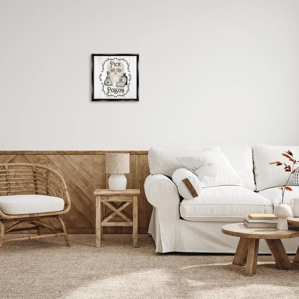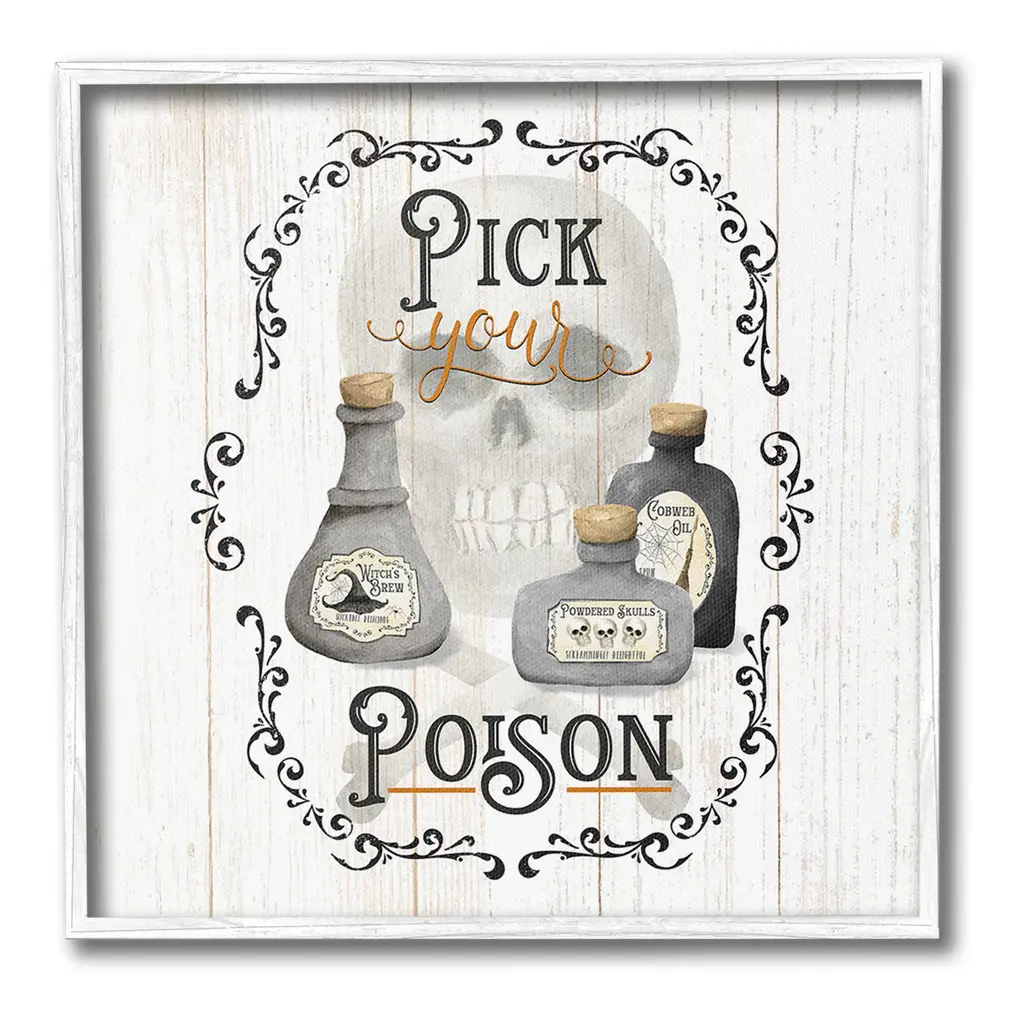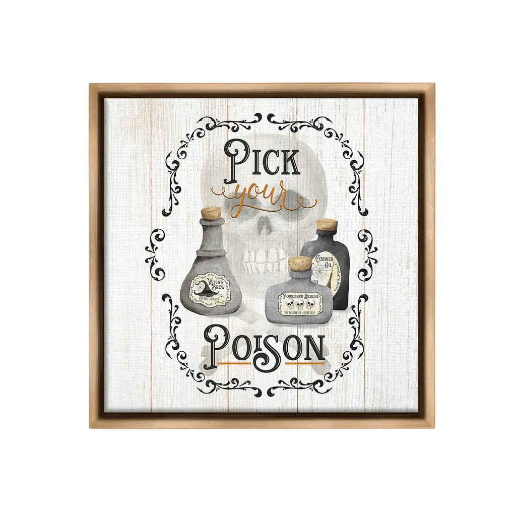 Elevate your home or office to the next level with Stupell Framed Floating Canvas Wall Art. Our premium hand-stretched canvas is mounted securely into a sturdy lightweight frame. The museum-style gap between the wrapped canvas and the box frame gives the illusion of floating artwork. Stupell Wall Art is made in the USA.Features: Dimensions: 18 x 1.7 x 18 Frame, 17 x 1.5 x 17 Canvas ArtFloating Frame Canvas Products are available in sizes 18"x18" and 25"x25". All Floating Frame Canvas Products have a 1.7" Depth.Wall Art is Ready to Hang with Hardware Free Hanging. No Installation required. For Easy Set Up Lean or Layer Artwork on Shelf or Against Wall. Artwork is Permently Fixed into the Frame.Our elevated 1.7" Thick Floating Frame is the perfect complement to our canvas style Wall Art. We use only the highest quality inks in house with industry leading printing solutions. Canvas is hand stretched over a durable wood foundation and then mounted securly into a Modern Box Frame. Made in the USA.Artwork Relates To: Bottle, Jar, Witch, Herb, Brew, Potion, Skull, Halloween, Vintage, Rustic, Phrase, Pattern, Pick Your PoisonDesign by Deane Beesley