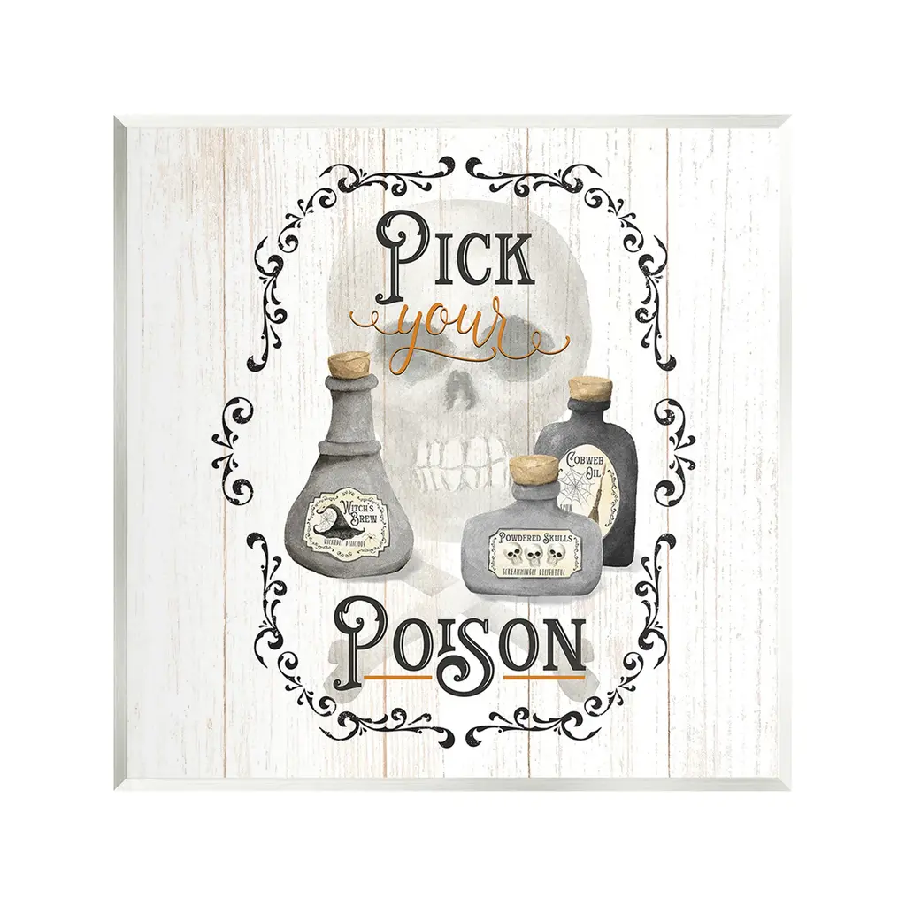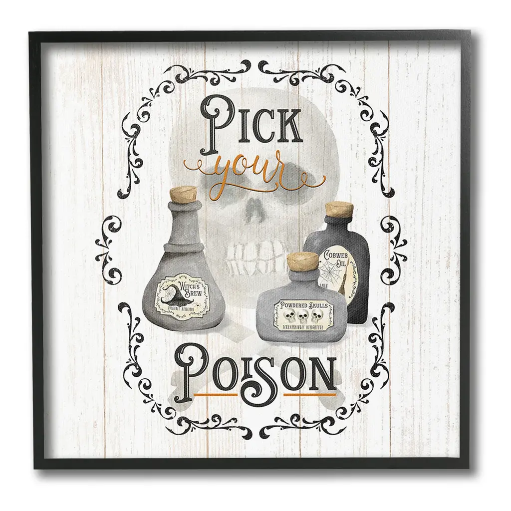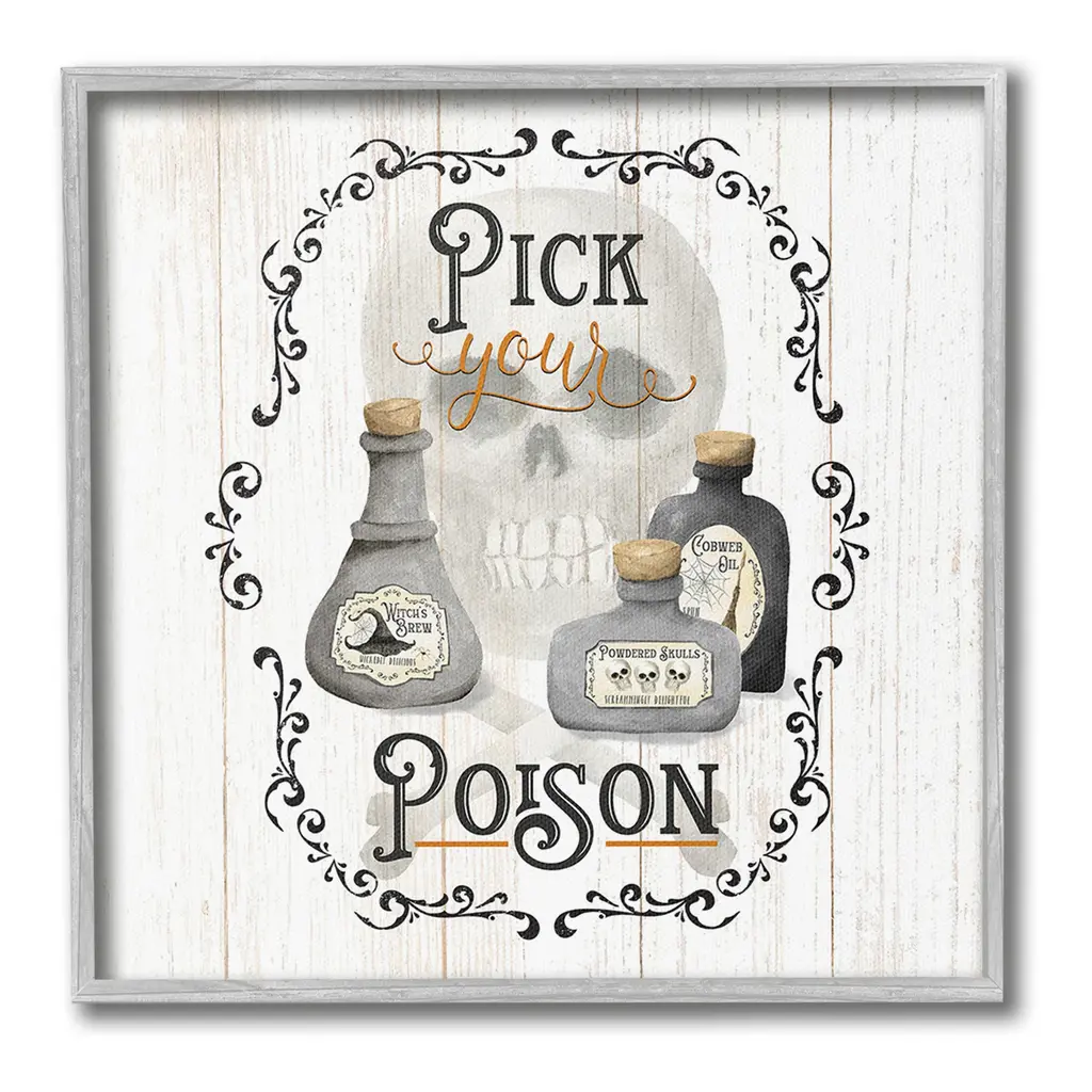 Elevate your home or office to the next level with Stupell Framed Floating Canvas Wall Art. Our premium hand-stretched canvas is mounted securely into a sturdy lightweight frame. The museum-style gap between the wrapped canvas and the box frame gives the illusion of floating artwork. Stupell Wall Art is made in the USA.Features: Dimensions: 18 x 1.7 x 18 Frame, 17 x 1.5 x 17 Canvas ArtFloating Frame Canvas Products are available in sizes 18"x18" and 25"x25". All Floating Frame Canvas Products have a 1.7" Depth.Wall Art is Ready to Hang with Hardware Free Hanging. No Installation required. For Easy Set Up Lean or Layer Artwork on Shelf or Against Wall. Artwork is Permently Fixed into the Frame.Our elevated 1.7" Thick Floating Frame is the perfect complement to our canvas style Wall Art. We use only the highest quality inks in house with industry leading printing solutions. Canvas is hand stretched over a durable wood foundation and then mounted securly into a Modern Box Frame. Made in the USA.Artwork Relates To: Bottle, Jar, Witch, Herb, Brew, Potion, Skull, Halloween, Vintage, Rustic, Phrase, Pattern, Pick Your PoisonDesign by Deane Beesley