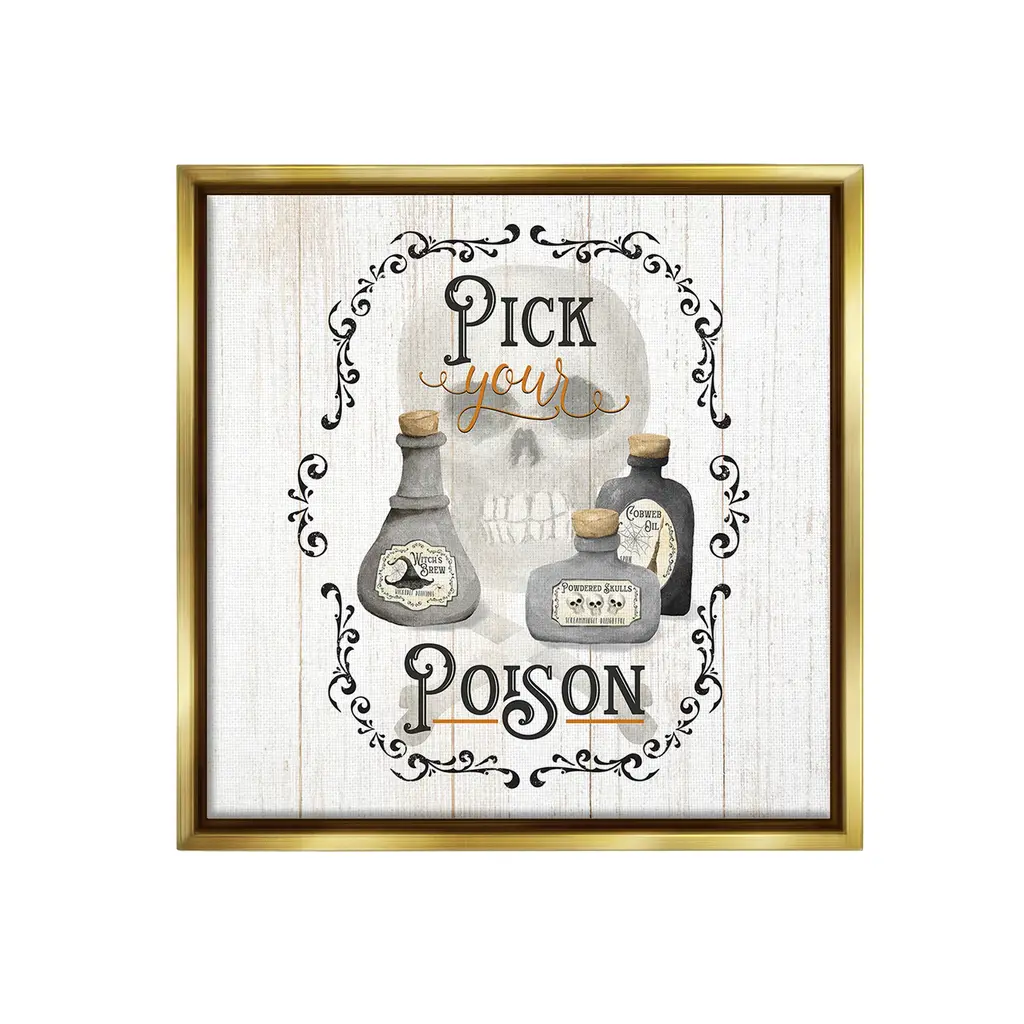 Elevate your home or office to the next level with Stupell Framed Floating Canvas Wall Art. Our premium hand-stretched canvas is mounted securely into a sturdy lightweight frame. The museum-style gap between the wrapped canvas and the box frame gives the illusion of floating artwork. Stupell Wall Art is made in the USA.Features: Dimensions: 18 x 1.7 x 18 Frame, 17 x 1.5 x 17 Canvas ArtFloating Frame Canvas Products are available in sizes 18"x18" and 25"x25". All Floating Frame Canvas Products have a 1.7" Depth.Wall Art is Ready to Hang with Hardware Free Hanging. No Installation required. For Easy Set Up Lean or Layer Artwork on Shelf or Against Wall. Artwork is Permently Fixed into the Frame.Our elevated 1.7" Thick Floating Frame is the perfect complement to our canvas style Wall Art. We use only the highest quality inks in house with industry leading printing solutions. Canvas is hand stretched over a durable wood foundation and then mounted securly into a Modern Box Frame. Made in the USA.Artwork Relates To: Bottle, Jar, Witch, Herb, Brew, Potion, Skull, Halloween, Vintage, Rustic, Phrase, Pattern, Pick Your PoisonDesign by Deane Beesley