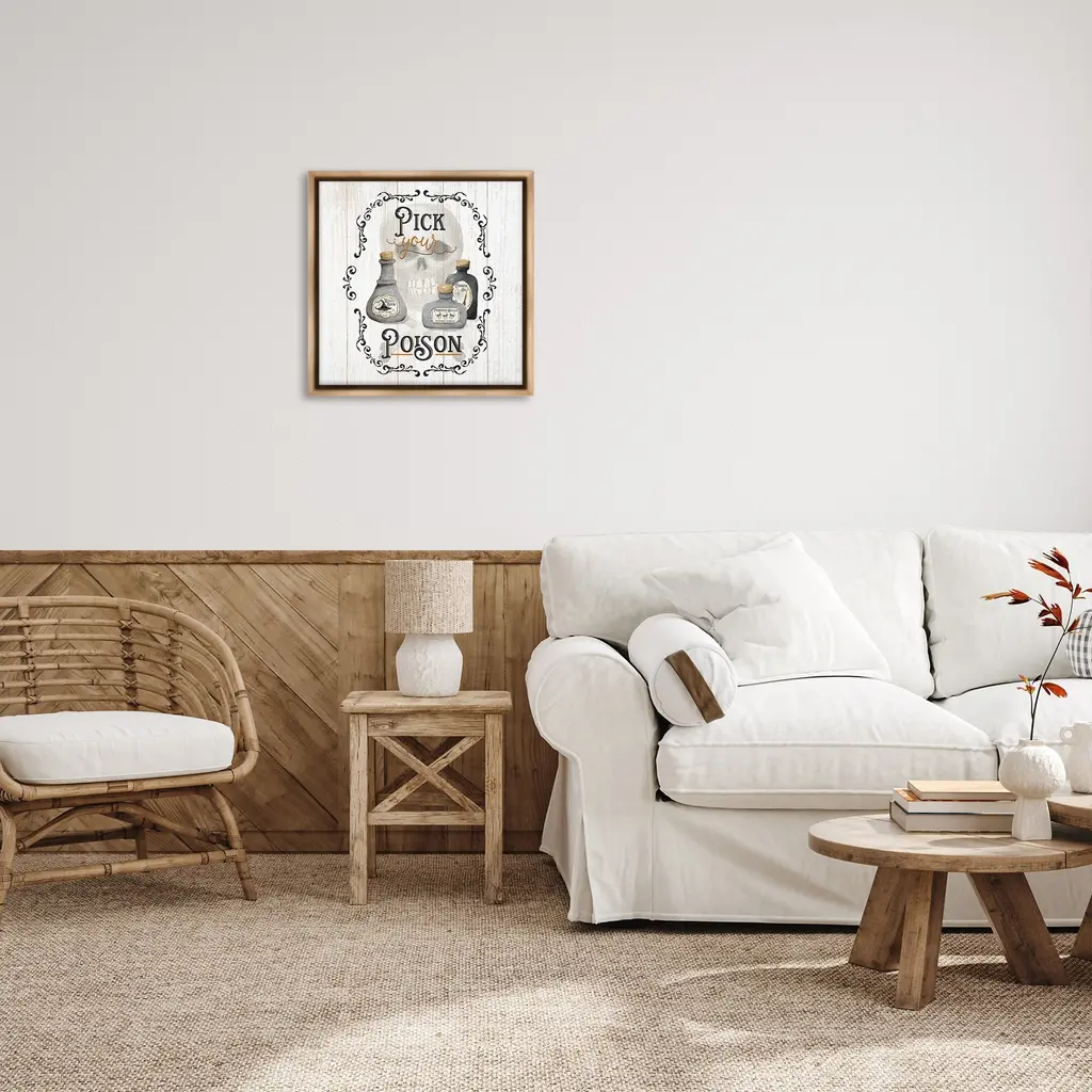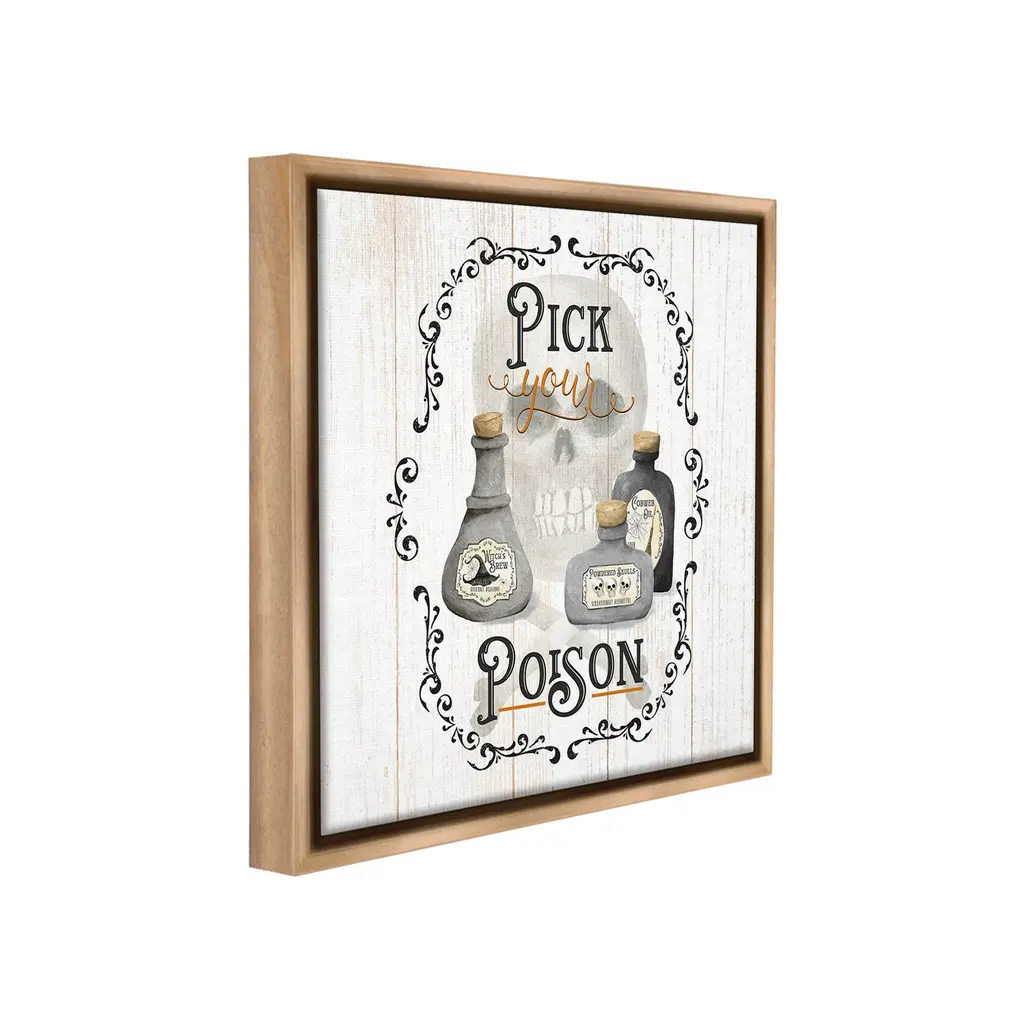 Elevate your home or office to the next level with Stupell Framed Floating Canvas Wall Art. Our premium hand-stretched canvas is mounted securely into a sturdy lightweight frame. The museum-style gap between the wrapped canvas and the box frame gives the illusion of floating artwork. Stupell Wall Art is made in the USA.Features: Dimensions: 18 x 1.7 x 18 Frame, 17 x 1.5 x 17 Canvas ArtFloating Frame Canvas Products are available in sizes 18"x18" and 25"x25". All Floating Frame Canvas Products have a 1.7" Depth.Wall Art is Ready to Hang with Hardware Free Hanging. No Installation required. For Easy Set Up Lean or Layer Artwork on Shelf or Against Wall. Artwork is Permently Fixed into the Frame.Our elevated 1.7" Thick Floating Frame is the perfect complement to our canvas style Wall Art. We use only the highest quality inks in house with industry leading printing solutions. Canvas is hand stretched over a durable wood foundation and then mounted securly into a Modern Box Frame. Made in the USA.Artwork Relates To: Bottle, Jar, Witch, Herb, Brew, Potion, Skull, Halloween, Vintage, Rustic, Phrase, Pattern, Pick Your PoisonDesign by Deane Beesley