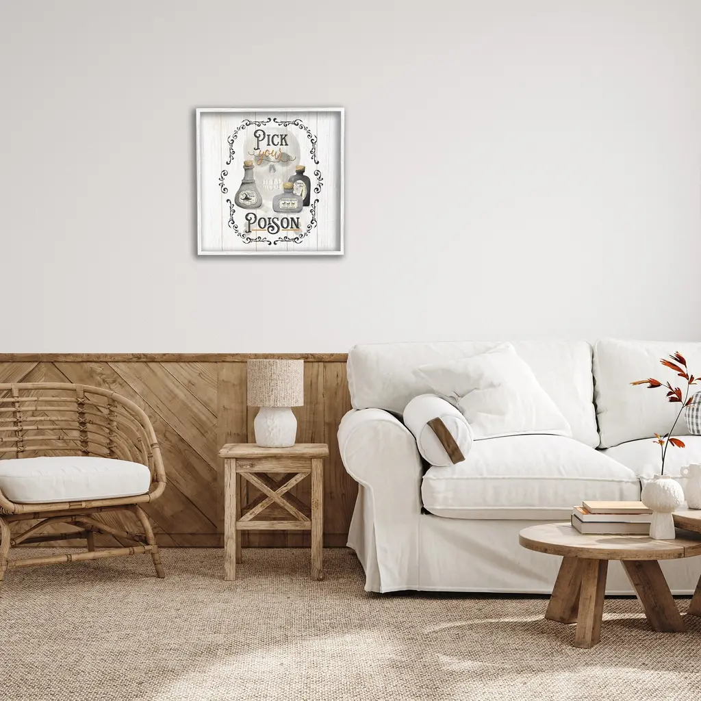 Add dimension to any room with our textured Framed Giclee Artwork. Our framed artwork is securely mounted into a 1.5-inch thick wood grain frame and ready to hang. Frames are available in three alluring styles: black, gray farmhouse and white. In addition, you should check out our oversized options if you want a statement piece. Stupell Wall Art is made in the USA.Features: Dimensions: 12 x 1.5 x 12 FramedFramed Giclee Product Sizes Include 12"x12", 17"x17", and 24"x24". Framed Giclee Products have a 1.5" Depth. Wall Art is Ready to Hang with Hardware Free Hanging. No installation required. For Easy Set Up Lean or Layer Artwork on Shelf or Against Wall.Our giclée prints are carefully mounted on a durable MDF backing, and then perfectly finished in a 1.5 inch thick woodgrain frame. Mounted frame colors include black, gray farmhouse and white. Made In USA.Artwork Relates To: Bottle, Jar, Witch, Herb, Brew, Potion, Skull, Halloween, Vintage, Rustic, Phrase, Pattern, Pick Your PoisonDesign by Deane Beesley