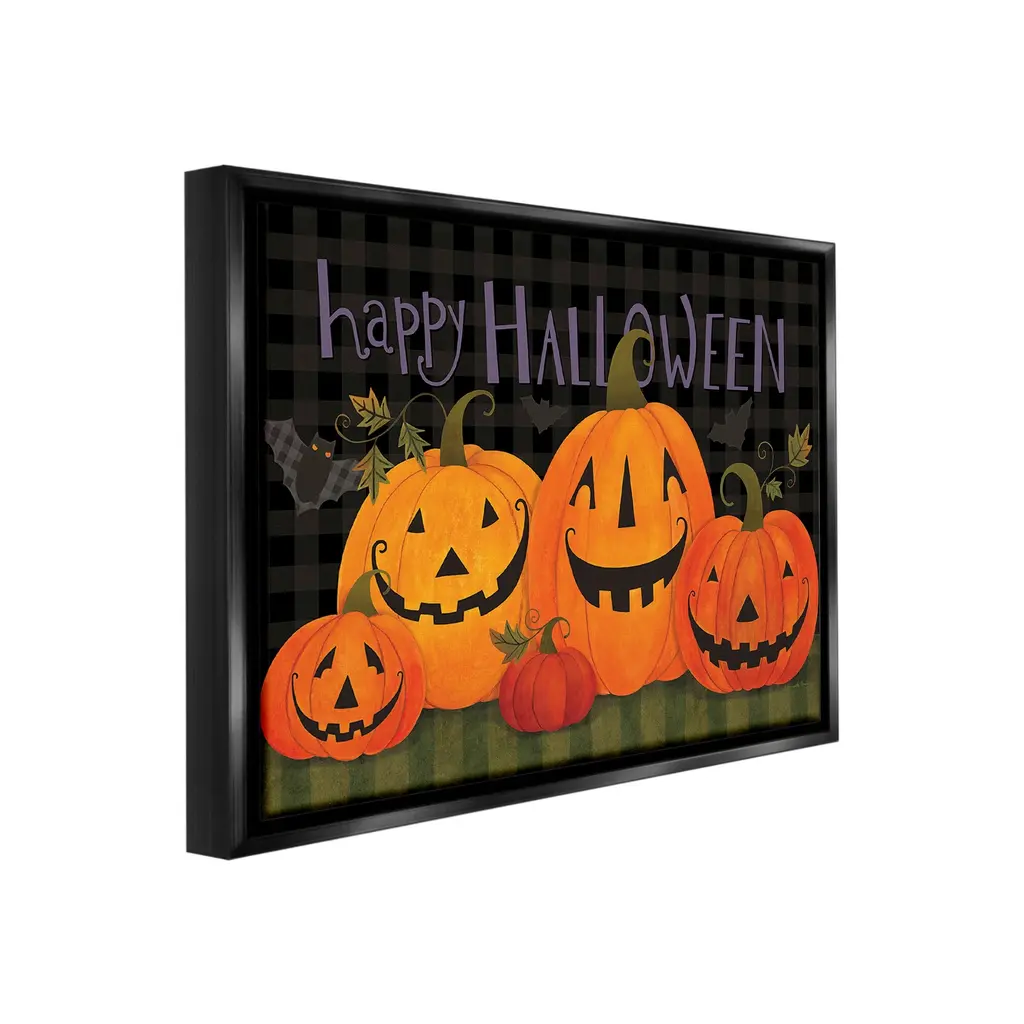 Elevate your home or office to the next level with Stupell Framed Floating Canvas Wall Art. Our premium hand-stretched canvas is mounted securely into a sturdy lightweight frame. The museum-style gap between the wrapped canvas and the box frame gives the illusion of floating artwork. Stupell Wall Art is made in the USA.Features: Dimensions: 21 x 1.7 x 17 Frame, 20 x 1.5 x 16 Canvas ArtFloating Frame Canvas Products are available in sizes 21"x17" and 31"x25". All Floating Frame Canvas Products have a 1.7" Depth.Wall Art is Ready to Hang with Hardware Free Hanging. No Installation required. For Easy Set Up Lean or Layer Artwork on Shelf or Against Wall. Artwork is Permently Fixed into the Frame.Our elevated 1.7" Thick Floating Frame is the perfect complement to our canvas style Wall Art. We use only the highest quality inks in house with industry leading printing solutions. Canvas is hand stretched over a durable wood foundation and then mounted securly into a Modern Box Frame. Made in the USA.Artwork Relates To: Festival, Halloween, Jack-o-lantern, Pumpkin, Botanical, Bat, Plaid, Pattern, Happy HalloweenDesign by Bernadette Deming