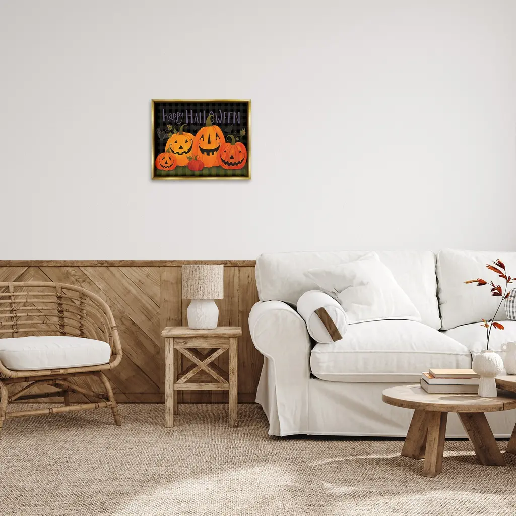 Elevate your home or office to the next level with Stupell Framed Floating Canvas Wall Art. Our premium hand-stretched canvas is mounted securely into a sturdy lightweight frame. The museum-style gap between the wrapped canvas and the box frame gives the illusion of floating artwork. Stupell Wall Art is made in the USA.Features: Dimensions: 21 x 1.7 x 17 Frame, 20 x 1.5 x 16 Canvas ArtFloating Frame Canvas Products are available in sizes 21"x17" and 31"x25". All Floating Frame Canvas Products have a 1.7" Depth.Wall Art is Ready to Hang with Hardware Free Hanging. No Installation required. For Easy Set Up Lean or Layer Artwork on Shelf or Against Wall. Artwork is Permently Fixed into the Frame.Our elevated 1.7" Thick Floating Frame is the perfect complement to our canvas style Wall Art. We use only the highest quality inks in house with industry leading printing solutions. Canvas is hand stretched over a durable wood foundation and then mounted securly into a Modern Box Frame. Made in the USA.Artwork Relates To: Festival, Halloween, Jack-o-lantern, Pumpkin, Botanical, Bat, Plaid, Pattern, Happy HalloweenDesign by Bernadette Deming