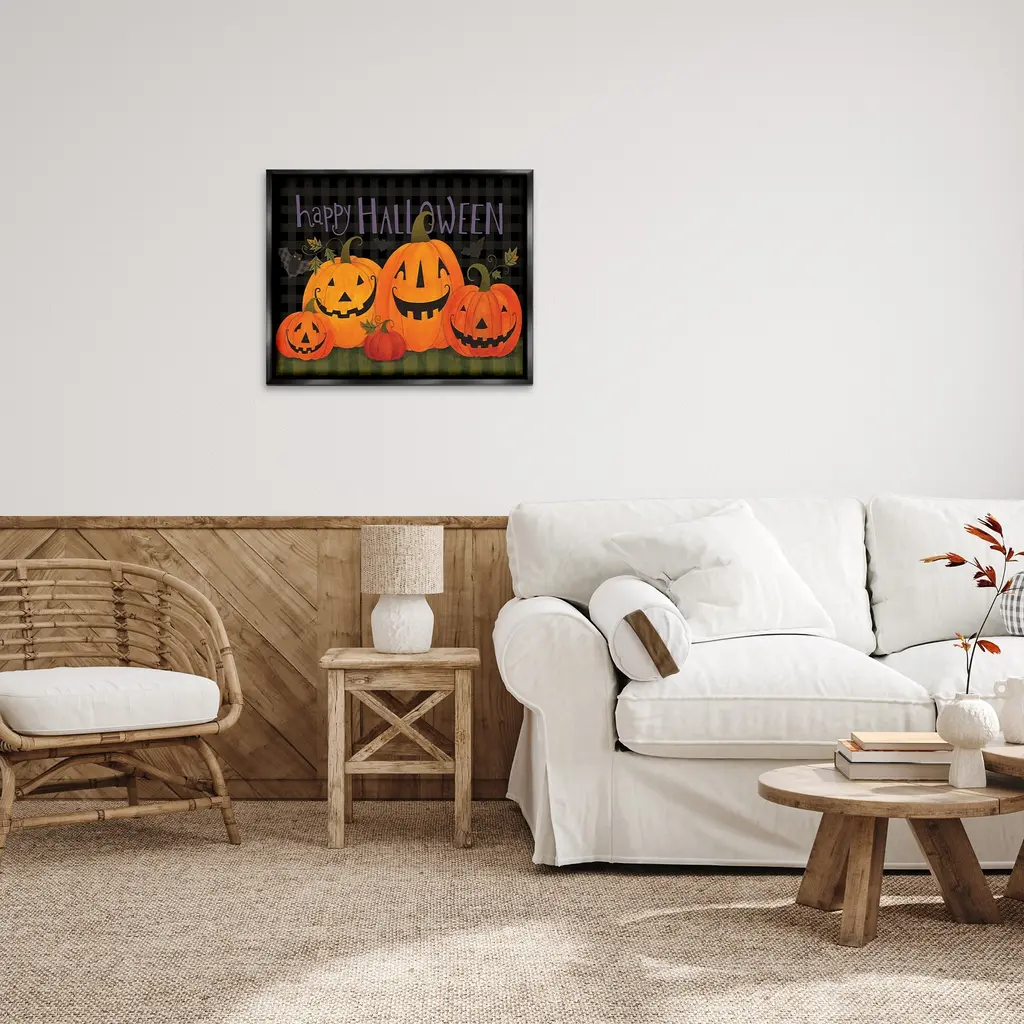 Elevate your home or office to the next level with Stupell Framed Floating Canvas Wall Art. Our premium hand-stretched canvas is mounted securely into a sturdy lightweight frame. The museum-style gap between the wrapped canvas and the box frame gives the illusion of floating artwork. Stupell Wall Art is made in the USA.Features: Dimensions: 21 x 1.7 x 17 Frame, 20 x 1.5 x 16 Canvas ArtFloating Frame Canvas Products are available in sizes 21"x17" and 31"x25". All Floating Frame Canvas Products have a 1.7" Depth.Wall Art is Ready to Hang with Hardware Free Hanging. No Installation required. For Easy Set Up Lean or Layer Artwork on Shelf or Against Wall. Artwork is Permently Fixed into the Frame.Our elevated 1.7" Thick Floating Frame is the perfect complement to our canvas style Wall Art. We use only the highest quality inks in house with industry leading printing solutions. Canvas is hand stretched over a durable wood foundation and then mounted securly into a Modern Box Frame. Made in the USA.Artwork Relates To: Festival, Halloween, Jack-o-lantern, Pumpkin, Botanical, Bat, Plaid, Pattern, Happy HalloweenDesign by Bernadette Deming