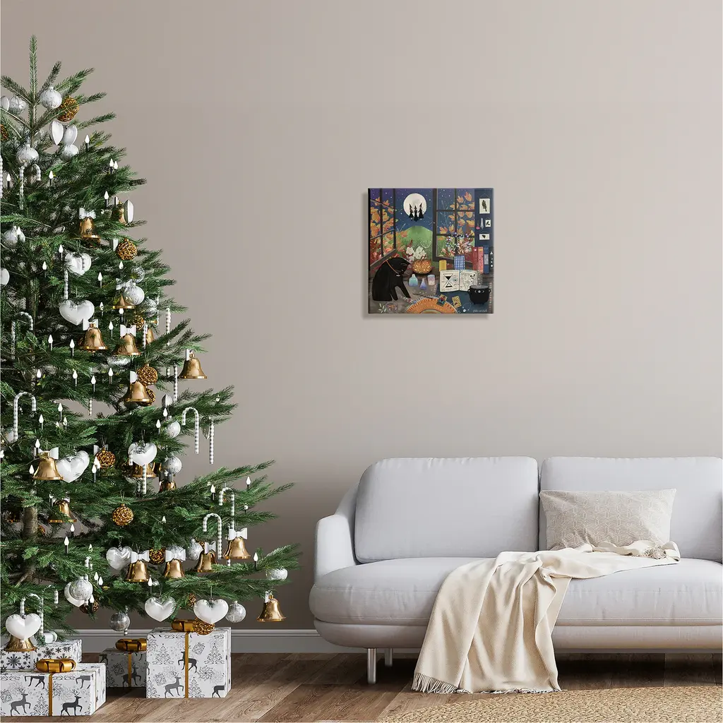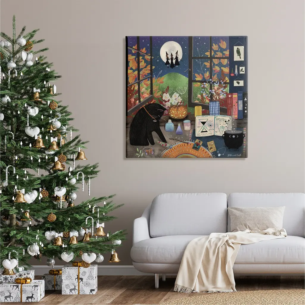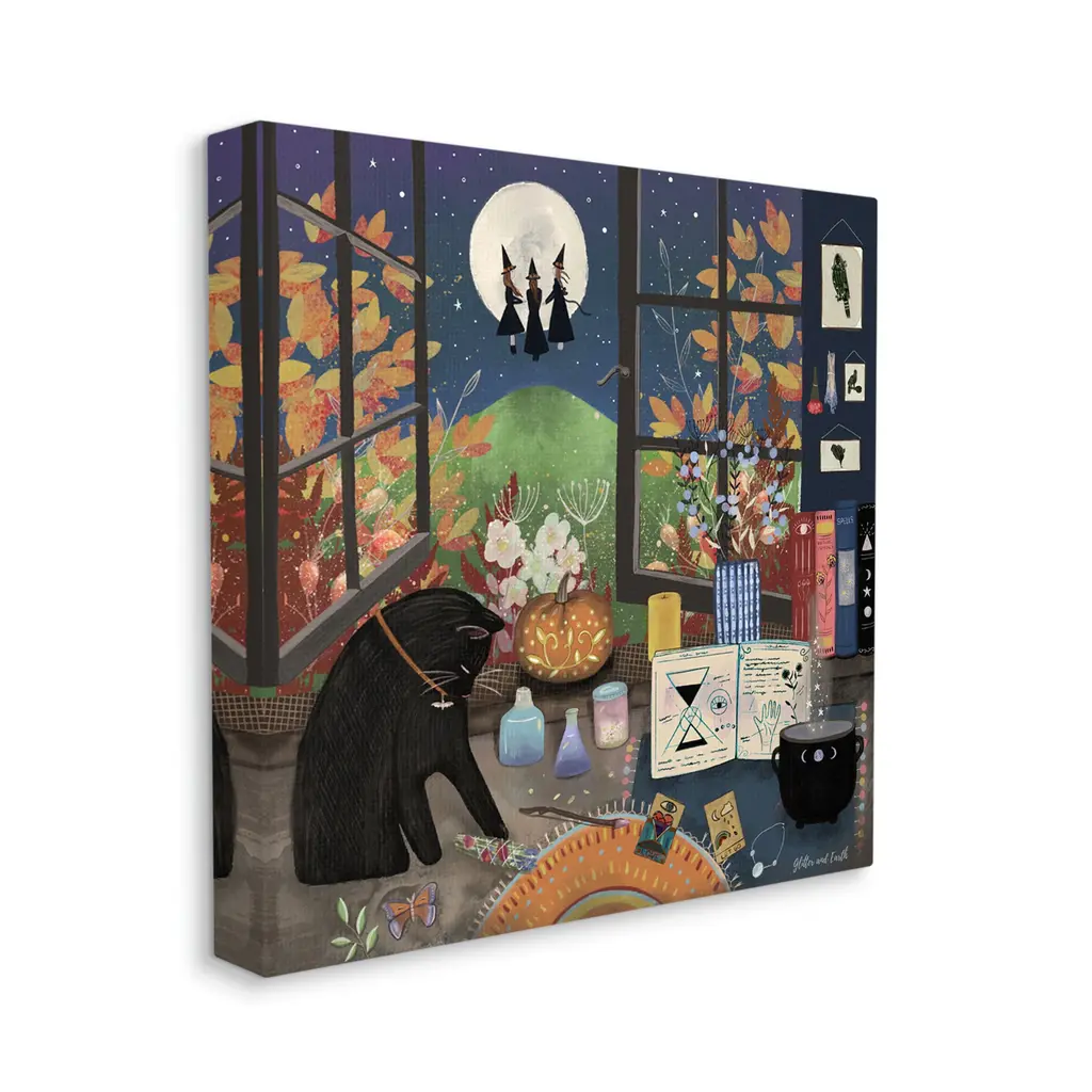 We create our stretched canvas to the highest standards. Using only the highest quality inks and canvas on Mimaki printers, we hand-cut and stretch each piece over a 1.5-inch thick wooden frame for hanging. As a result, the art comes ready to hang on the sturdy ledge with no installation required. Stupell Wall Art is made in the USA.Features: Dimensions: 17 x 1.5 x 17 InchesStretched Canvas Sizes Include Standard: 17 x 1.5 x 17 Large: 24 x 1.5 x 24 X-Large: 30 x 1.5 x 30 Oversized: 36 x 1.5 x 36Wall Art is Ready to Hang - No Installation or Hardware Needed. For Easy Set Up Lean or Layer Artwork on Shelf or Against Wall.Our stretched canvas is created with the highest standards. We use only the highest quality inks and canvas on our in house Mimaki printers, and then hand cut and stretch each piece over a 1.5 inch thick wooden frame for hanging. Made In USA.Artwork Relates To: Witch, Cat, Black Cat, Seasonal, Halloween, Autumn, Moon, Night, Tarot Cards, BotanicalDesign by Jacqueline Wild