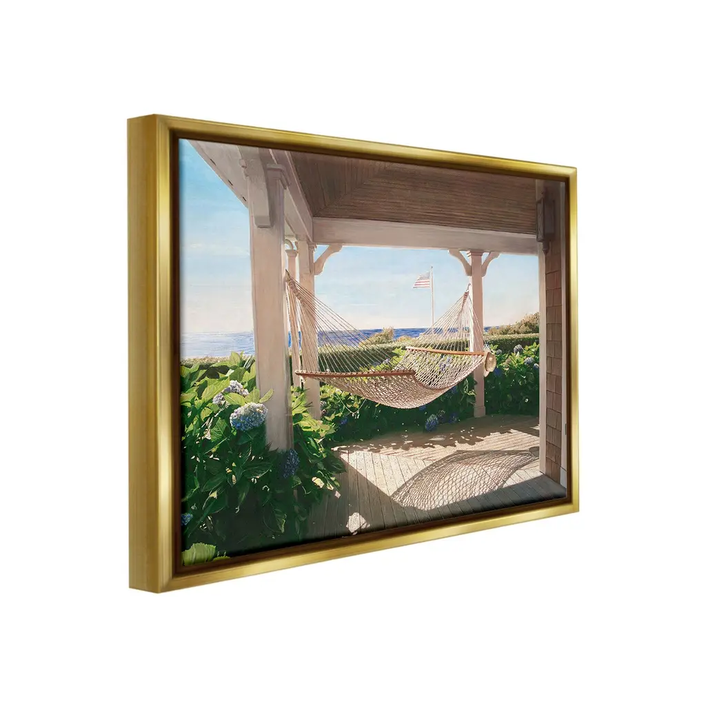 Elevate your home or office to the next level with Stupell Framed Floating Canvas Wall Art. Our premium hand-stretched canvas is mounted securely into a sturdy lightweight frame. The museum-style gap between the wrapped canvas and the box frame gives the illusion of floating artwork. Stupell Wall Art is made in the USA.Features: Dimensions: 21 x 1.7 x 17 Frame, 20 x 1.5 x 16 Canvas ArtFloating Frame Canvas Products are available in sizes 21"x17" and 31"x25". All Floating Frame Canvas Products have a 1.7" Depth.Wall Art is Ready to Hang with Hardware Free Hanging. No Installation required. For Easy Set Up Lean or Layer Artwork on Shelf or Against Wall. Artwork is Permently Fixed into the Frame.Our elevated 1.7" Thick Floating Frame is the perfect complement to our canvas style Wall Art. We use only the highest quality inks in house with industry leading printing solutions. Canvas is hand stretched over a durable wood foundation and then mounted securly into a Modern Box Frame. Made in the USA.Artwork Relates To: House, Porch, Balcony, Hammock, Flag, American Flag, Ocean, Nautical, Beach, Coastal, Cape, BayDesign by Tom Mielko