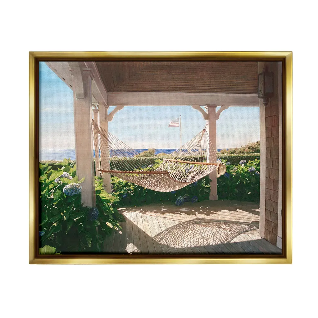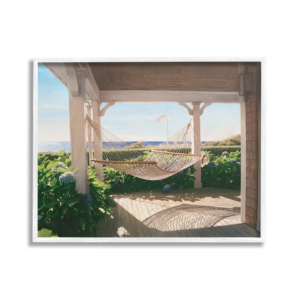 Add dimension to any room with our textured Framed Giclee Artwork. Our framed artwork is securely mounted into a 1.5-inch thick wood grain frame and ready to hang. Frames are available in three alluring styles: black, gray farmhouse and white. In addition, you should check out our oversized options if you want a statement piece. Stupell Wall Art is made in the USA.Features: Dimensions: 14 x 1.5 x 11 FramedFramed Giclee Products are available in the sizes 14"x11", 20"x16" or 30"x24". All Framed Giclee Products have a 1.5" Depth. Wall Art is Ready to Hang with Hardware Free Hanging. No installation required. For Easy Set Up Lean or Layer Artwork on Shelf or Against Wall.Our giclée prints are carefully mounted on a durable MDF backing, and then perfectly finished in a 1.5 inch thick woodgrain frame. Mounted frame colors include black, gray farmhouse and white. Made In USA.Artwork Relates To: House, Porch, Balcony, Hammock, Flag, American Flag, Ocean, Nautical, Beach, Coastal, Cape, BayDesign by Tom Mielko
