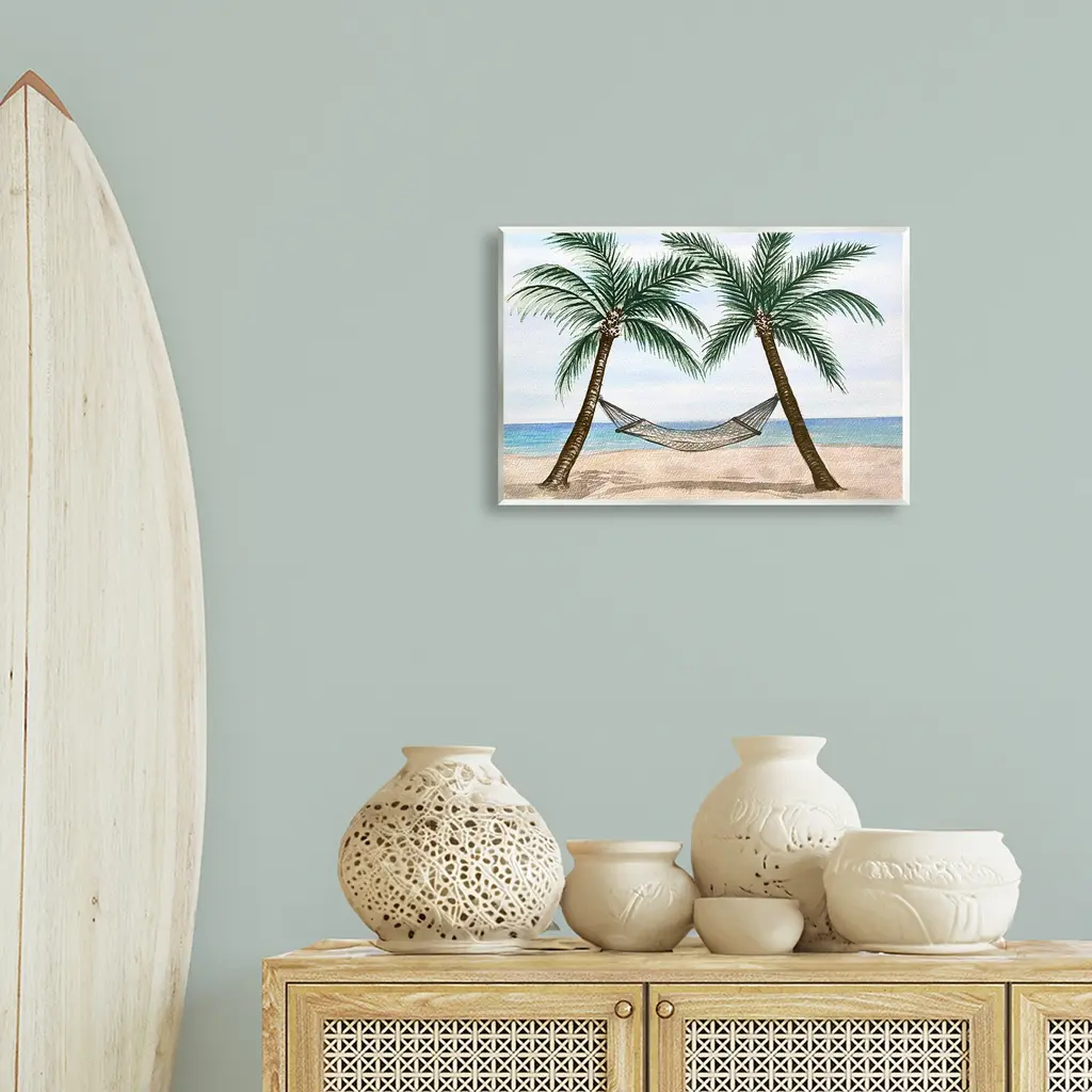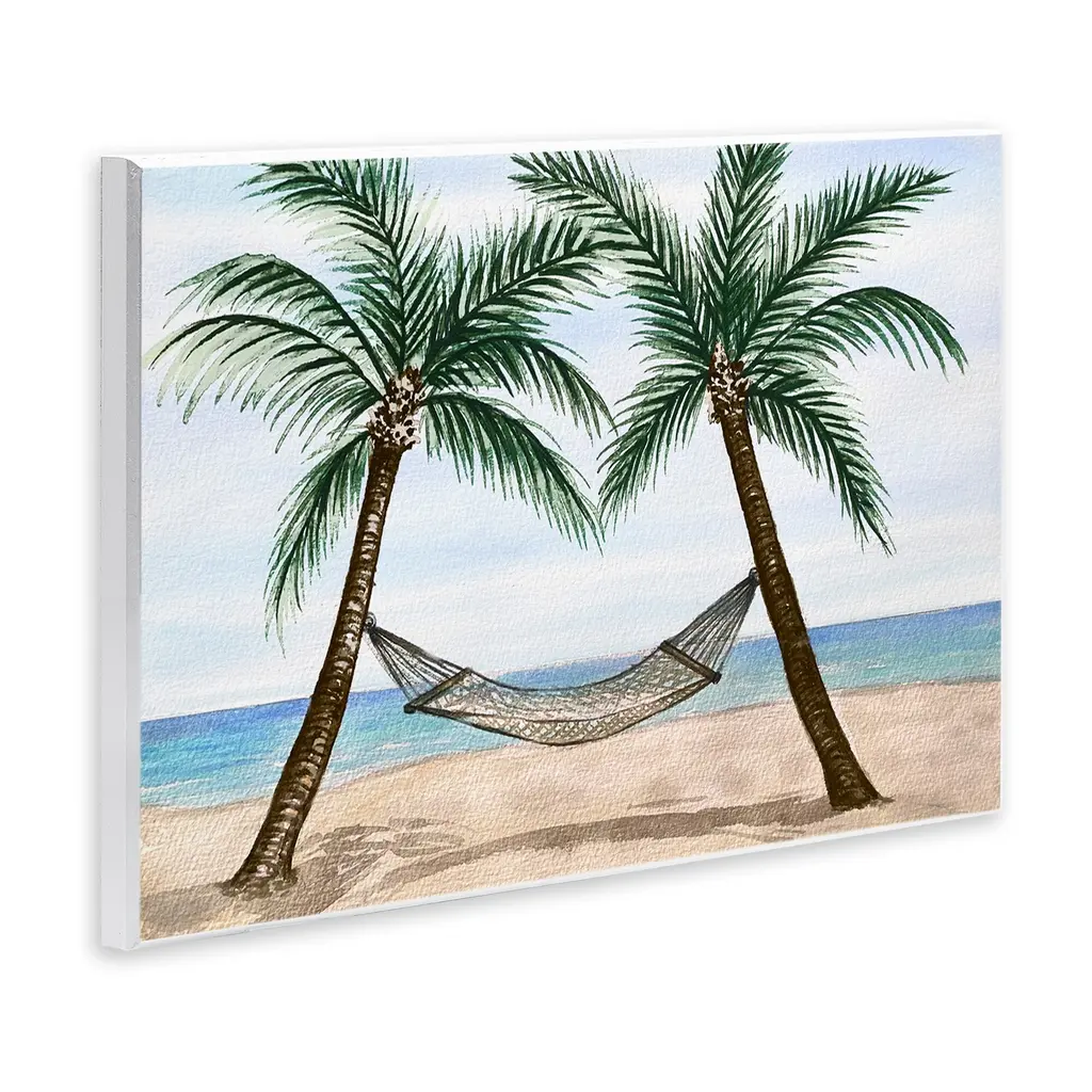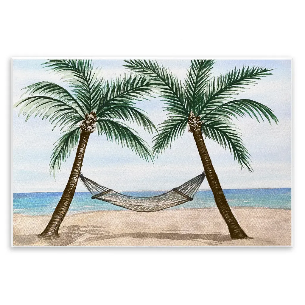 Our wall plaques start as high-quality lithograph prints mounted on durable 0.5-inch thick MDF wood. Each piece is hand finished and comes with a fresh layer of white foil on the sides to give it a crisp, clean look. Plaques arrive ready to hang without installation and come with removable plastic corners to keep them from damage in transit. Stupell Wall Art is made in the USA.Features: Dimensions: 15 x 0.5 x 10 InchesWall Plaque Product Sizes Include 15"x10" and 19"x13". All wall plaque products have a 0.5" Depth. Wall Art is Ready to Hang with Hardware Free Hanging. No installation required. For Easy Set Up Lean or Layer Artwork on Shelf or Against Wall.All of our wall plaques start off as high quality lithograph prints that are then mounted on durable 0.5 inch thick MDF wood. Each piece is hand finished and comes with a fresh layer of foil on the sides to give it a crisp clean look. Made In USA.Artwork Relates To: Plant, Tree, Palm Tree, Hammock, Nature, Tropical, Summer, BeachDesign by Nicholas Biscardi