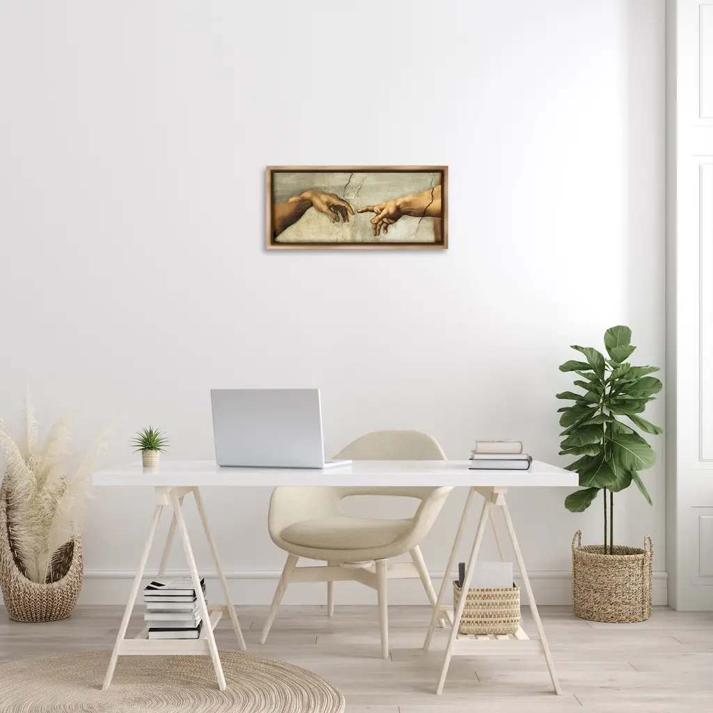Elevate your home or office to the next level with Stupell Framed Floating Canvas Wall Art. Our premium hand-stretched canvas is mounted securely into a sturdy lightweight frame. The museum-style gap between the wrapped canvas and the box frame gives the illusion of floating artwork. Stupell Wall Art is made in the USA.Features: Dimensions: 25 x 1.7 x 11 Frame, 24 x 1.5 x 10 Canvas ArtFloating Frame Canvas Products are available in sizes 25"x11" and 31"x14". All Floating Frame Canvas Products have a 1.7" Depth.Wall Art is Ready to Hang with Hardware Free Hanging. No Installation required. For Easy Set Up Lean or Layer Artwork on Shelf or Against Wall. Artwork is Permently Fixed into the Frame.Our elevated 1.7" Thick Floating Frame is the perfect complement to our canvas style Wall Art. We use only the highest quality inks in house with industry leading printing solutions. Canvas is hand stretched over a durable wood foundation and then mounted securly into a Modern Box Frame. Made in the USA.Artwork Relates To: Classic, Classical, Painting, Hands, Creation of AdamDesign by Michelangelo