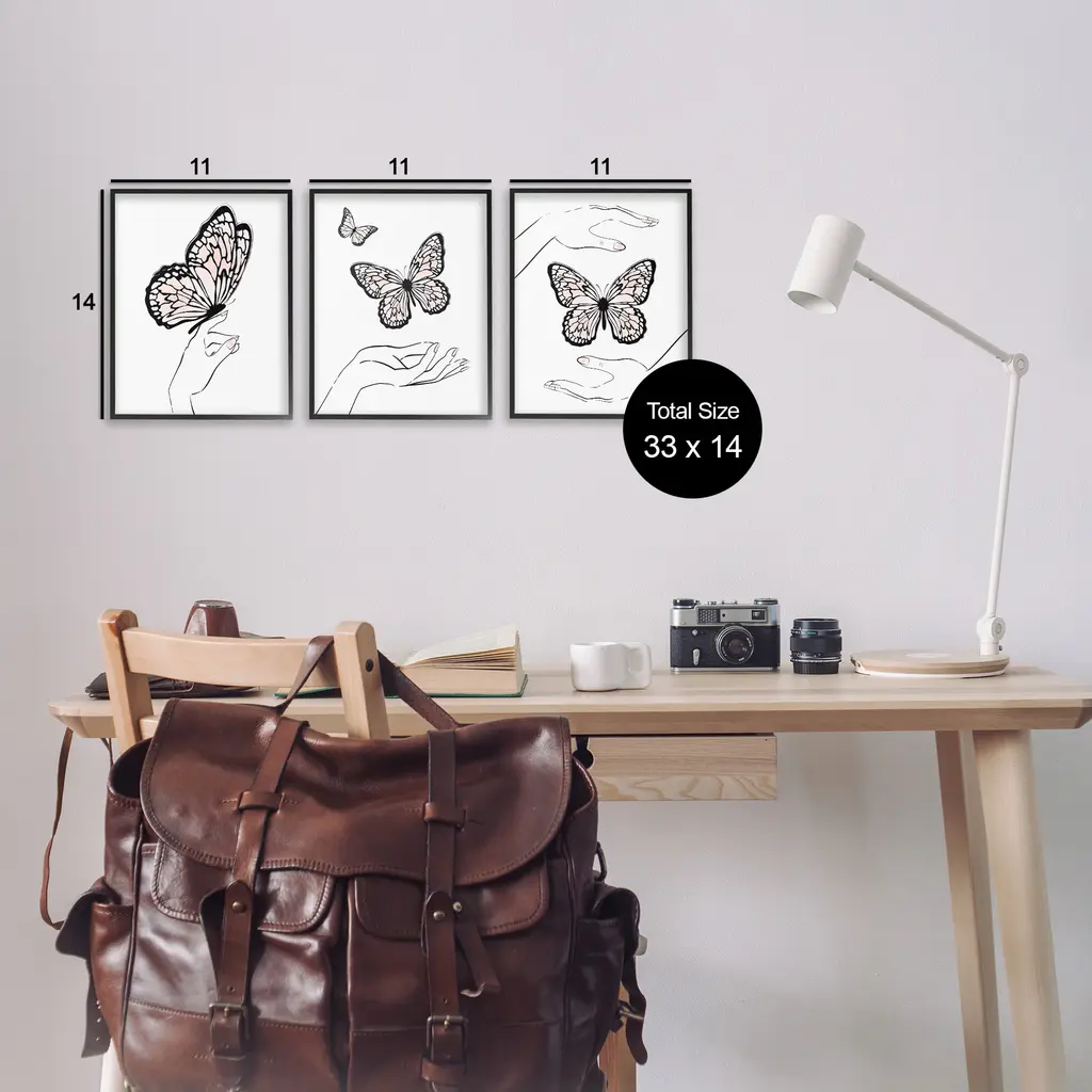 Fill any space in your home or office with our Framed Wall Art Sets. Our framed artwork is securely mounted into a 1.5-inch thick wood grain frame and ready to hang. Frames are available in three alluring styles: black, gray farmhouse and white. Stupell Wall Art is made in the USA.Features: Dimensions: 3 Piece Set, Each Panel is 11 x 1.5 x 14 FramedThree Piece Framed Giclee Sets are availabel as 11"x14", 16"x20", or 24"x30" Panels. All Framed Giclee Products have a 1.5" Depth.Wall Art is Ready to Hang with Hardware Free Hanging. No installation required. For Easy Set Up Lean or Layer Artwork on Shelf or Against Wall.Curated Wall Art Sets make it easy for you complete the theme for any room. Our giclée prints are carefully mounted on a durable MDF backing, and then perfectly finished in a 1.5 inch thick woodgrain frame. Mounted frame colors include black, gray farmhouse and white. Made In USA.Artwork Relates To: Hand, Person, Girl, Insect, Butterfly, MinimalDesign by Martina Pavlova