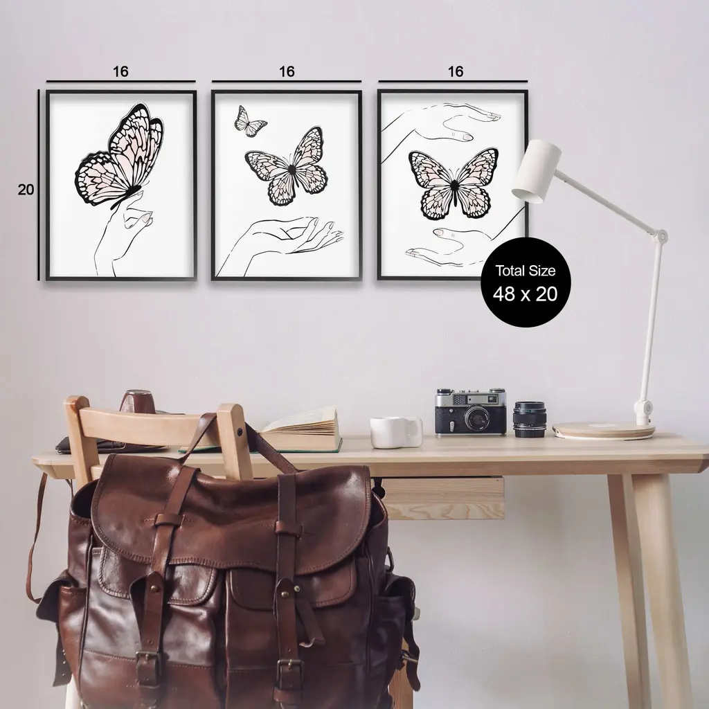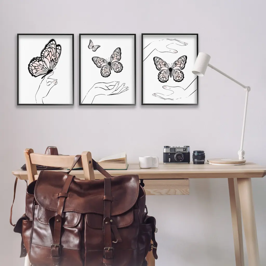 Fill any space in your home or office with our Framed Wall Art Sets. Our framed artwork is securely mounted into a 1.5-inch thick wood grain frame and ready to hang. Frames are available in three alluring styles: black, gray farmhouse and white. Stupell Wall Art is made in the USA.Features: Dimensions: 3 Piece Set, Each Panel is 11 x 1.5 x 14 FramedThree Piece Framed Giclee Sets are availabel as 11"x14", 16"x20", or 24"x30" Panels. All Framed Giclee Products have a 1.5" Depth.Wall Art is Ready to Hang with Hardware Free Hanging. No installation required. For Easy Set Up Lean or Layer Artwork on Shelf or Against Wall.Curated Wall Art Sets make it easy for you complete the theme for any room. Our giclée prints are carefully mounted on a durable MDF backing, and then perfectly finished in a 1.5 inch thick woodgrain frame. Mounted frame colors include black, gray farmhouse and white. Made In USA.Artwork Relates To: Hand, Person, Girl, Insect, Butterfly, MinimalDesign by Martina Pavlova