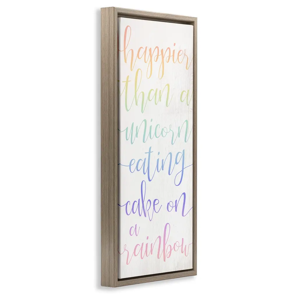 Elevate your home or office to the next level with Stupell Framed Floating Canvas Wall Art. Our premium hand-stretched canvas is mounted securely into a sturdy lightweight frame. The museum-style gap between the wrapped canvas and the box frame gives the illusion of floating artwork. Stupell Wall Art is made in the USA.Features: Dimensions: 11 x 1.7 x 25 Frame, 10 x 1.5 x 24 Canvas ArtFloating Frame Canvas Products are available in sizes 11"x25" and 14"x31". All Floating Frame Canvas Products have a 1.7" Depth.Wall Art is Ready to Hang with Hardware Free Hanging. No Installation required. For Easy Set Up Lean or Layer Artwork on Shelf or Against Wall. Artwork is Permently Fixed into the Frame.Our elevated 1.7" Thick Floating Frame is the perfect complement to our canvas style Wall Art. We use only the highest quality inks in house with industry leading printing solutions. Canvas is hand stretched over a durable wood foundation and then mounted securly into a Modern Box Frame. Made in the USA.Artwork Relates To: Phrase, Kid's, Rainbow, Humor, Unicorn, Pastel, HappinessDesign by Daphne Polselli