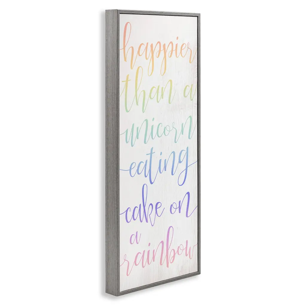 Add dimension to any room with our textured Framed Giclee Artwork. Our framed artwork is securely mounted into a 1.5-inch thick wood grain frame and ready to hang. Frames are available in three alluring styles: black, gray farmhouse and white. In addition, you should check out our oversized options if you want a statement piece. Stupell Wall Art is made in the USA.Features: Dimensions: 10 x 1.5 x 24 FramedFramed Giclee Product Sizes include 10"x24" and 13"x30". All Framed Giclee products have a 1.5" Depth.Wall Art is Ready to Hang with Hardware Free Hanging. No installation required. For Easy Set Up Lean or Layer Artwork on Shelf or Against Wall.Our giclée prints are carefully mounted on a durable MDF backing, and then perfectly finished in a 1.5 inch thick woodgrain frame. Mounted frame colors include black, gray farmhouse and white. Made In USA.Artwork Relates To: Phrase, Kid's, Rainbow, Humor, Unicorn, Pastel, HappinessDesign by Daphne Polselli