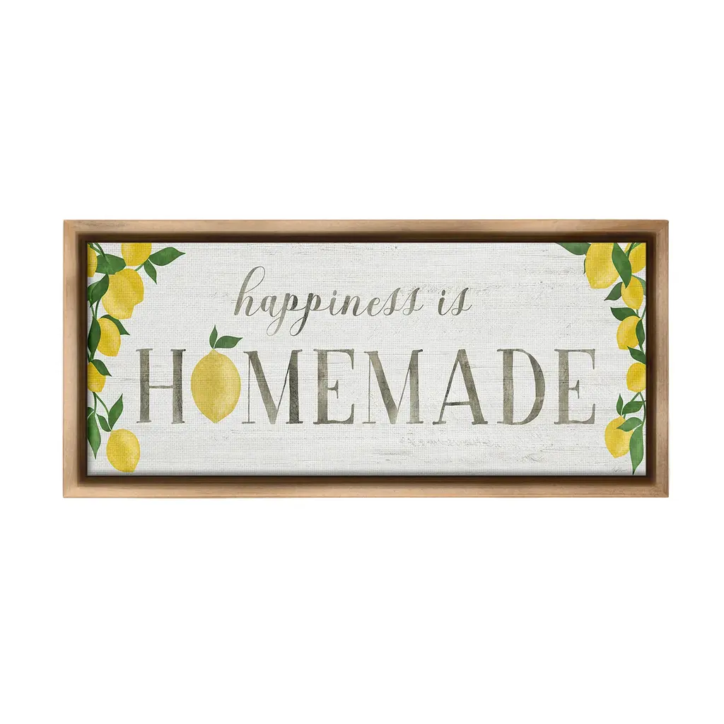 Elevate your home or office to the next level with Stupell Framed Floating Canvas Wall Art. Our premium hand-stretched canvas is mounted securely into a sturdy lightweight frame. The museum-style gap between the wrapped canvas and the box frame gives the illusion of floating artwork. Stupell Wall Art is made in the USA.Features: Dimensions: 25 x 1.7 x 11 Frame, 24 x 1.5 x 10 Canvas ArtFloating Frame Canvas Products are available in sizes 25"x11" and 31"x14". All Floating Frame Canvas Products have a 1.7" Depth.Wall Art is Ready to Hang with Hardware Free Hanging. No Installation required. For Easy Set Up Lean or Layer Artwork on Shelf or Against Wall. Artwork is Permently Fixed into the Frame.Our elevated 1.7" Thick Floating Frame is the perfect complement to our canvas style Wall Art. We use only the highest quality inks in house with industry leading printing solutions. Canvas is hand stretched over a durable wood foundation and then mounted securly into a Modern Box Frame. Made in the USA.Artwork Relates To: Citrus, Food, Fruit, Lemon, Plant, Produce, Country, Kitchen, Rustic, Happiness is HomemadeDesign by Natalie Carpentieri