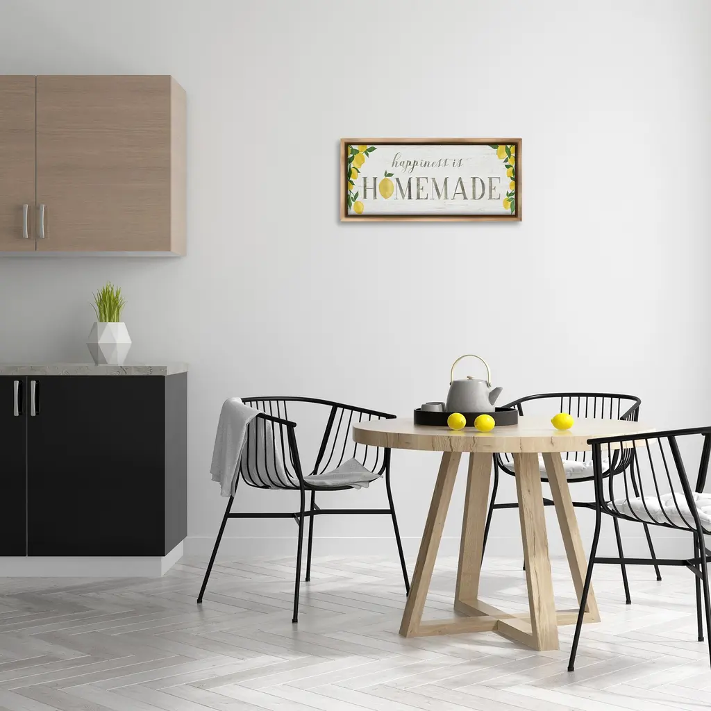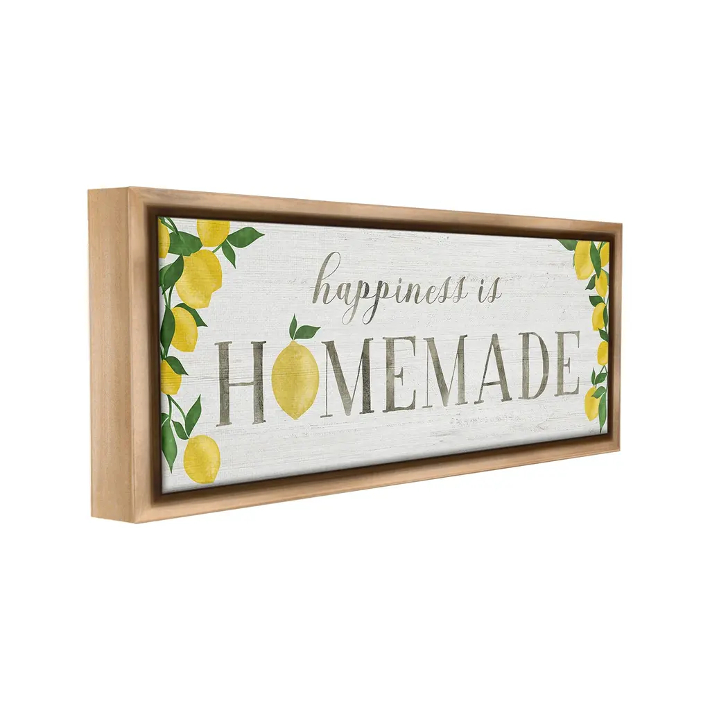 Elevate your home or office to the next level with Stupell Framed Floating Canvas Wall Art. Our premium hand-stretched canvas is mounted securely into a sturdy lightweight frame. The museum-style gap between the wrapped canvas and the box frame gives the illusion of floating artwork. Stupell Wall Art is made in the USA.Features: Dimensions: 25 x 1.7 x 11 Frame, 24 x 1.5 x 10 Canvas ArtFloating Frame Canvas Products are available in sizes 25"x11" and 31"x14". All Floating Frame Canvas Products have a 1.7" Depth.Wall Art is Ready to Hang with Hardware Free Hanging. No Installation required. For Easy Set Up Lean or Layer Artwork on Shelf or Against Wall. Artwork is Permently Fixed into the Frame.Our elevated 1.7" Thick Floating Frame is the perfect complement to our canvas style Wall Art. We use only the highest quality inks in house with industry leading printing solutions. Canvas is hand stretched over a durable wood foundation and then mounted securly into a Modern Box Frame. Made in the USA.Artwork Relates To: Citrus, Food, Fruit, Lemon, Plant, Produce, Country, Kitchen, Rustic, Happiness is HomemadeDesign by Natalie Carpentieri