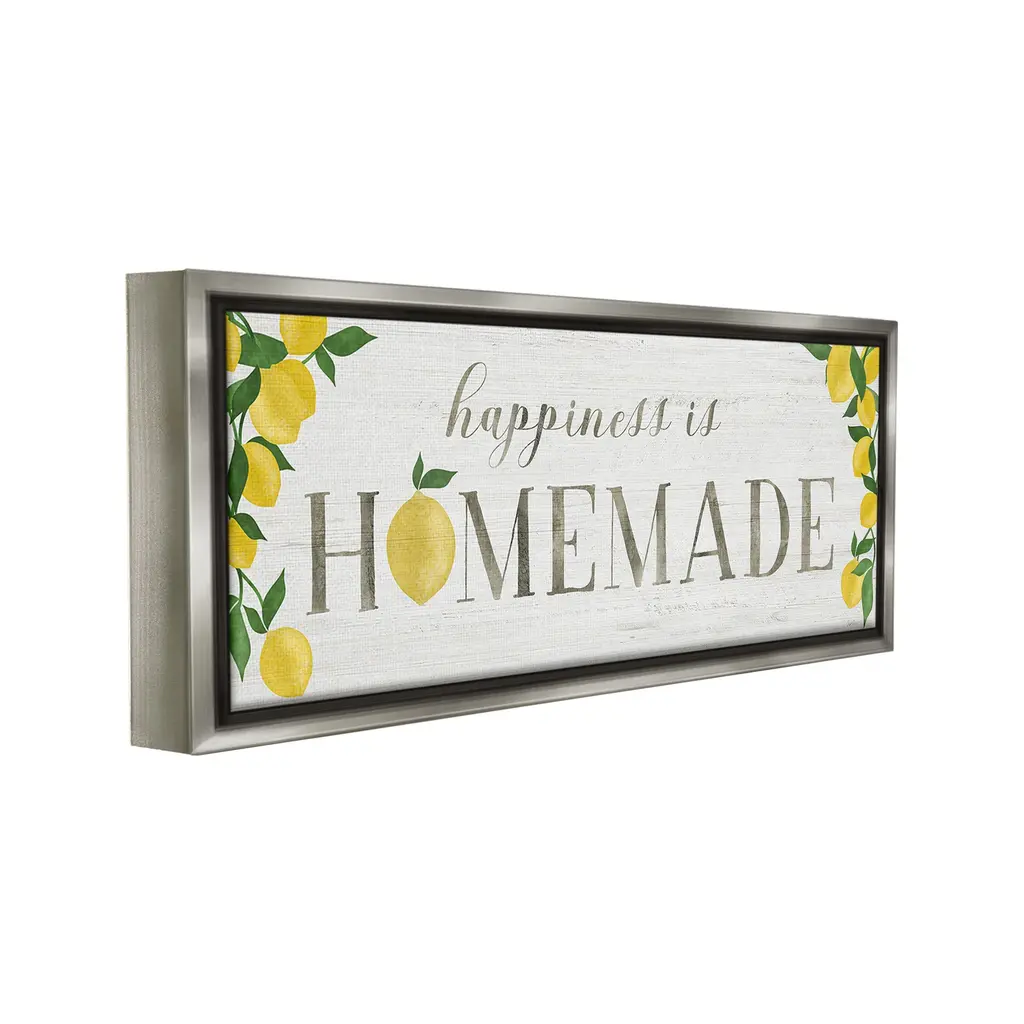 Elevate your home or office to the next level with Stupell Framed Floating Canvas Wall Art. Our premium hand-stretched canvas is mounted securely into a sturdy lightweight frame. The museum-style gap between the wrapped canvas and the box frame gives the illusion of floating artwork. Stupell Wall Art is made in the USA.Features: Dimensions: 25 x 1.7 x 11 Frame, 24 x 1.5 x 10 Canvas ArtFloating Frame Canvas Products are available in sizes 25"x11" and 31"x14". All Floating Frame Canvas Products have a 1.7" Depth.Wall Art is Ready to Hang with Hardware Free Hanging. No Installation required. For Easy Set Up Lean or Layer Artwork on Shelf or Against Wall. Artwork is Permently Fixed into the Frame.Our elevated 1.7" Thick Floating Frame is the perfect complement to our canvas style Wall Art. We use only the highest quality inks in house with industry leading printing solutions. Canvas is hand stretched over a durable wood foundation and then mounted securly into a Modern Box Frame. Made in the USA.Artwork Relates To: Citrus, Food, Fruit, Lemon, Plant, Produce, Country, Kitchen, Rustic, Happiness is HomemadeDesign by Natalie Carpentieri