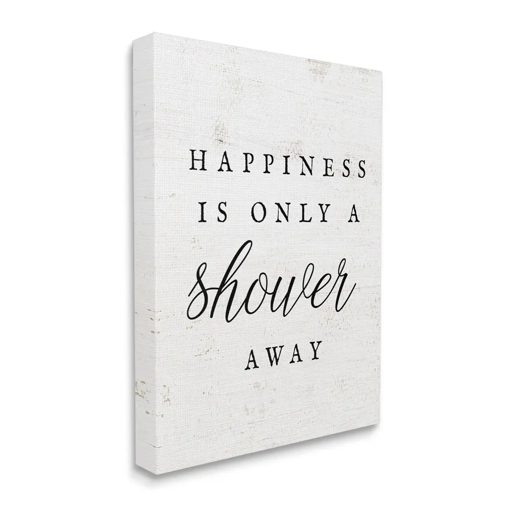 We create our stretched canvas to the highest standards. Using only the highest quality inks and canvas on Mimaki printers, we hand-cut and stretch each piece over a 1.5-inch thick wooden frame for hanging. As a result, the art comes ready to hang on the sturdy ledge with no installation required. Stupell Wall Art is made in the USA.Features: Dimensions: 16 x 1.5 x 20 InchesStretched Canvas Sizes Include Standard: 16 x 1.5 x 20 Large: 20 x 1.5 x 30 X-Large: 30 x 1.5 x 40 Oversized: 36 x 1.5 x 48Wall Art is Ready to Hang - No Installation or Hardware Needed. For Easy Set Up Lean or Layer Artwork on Shelf or Against Wall.Our stretched canvas is created with the highest standards. We use only the highest quality inks and canvas on our in house Mimaki printers, and then hand cut and stretch each piece over a 1.5 inch thick wooden frame for hanging. Made In USA.Artwork Relates To: Rustic, Farmhouse, Bathroom, Phrase, Happiness Is Only A Shower AwayDesign by Lil' Rue