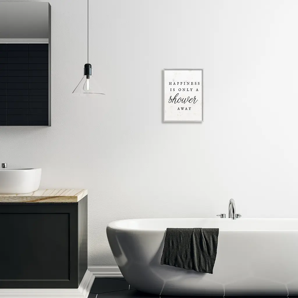 Add dimension to any room with our textured Framed Giclee Artwork. Our framed artwork is securely mounted into a 1.5-inch thick wood grain frame and ready to hang. Frames are available in three alluring styles: black, gray farmhouse and white. In addition, you should check out our oversized options if you want a statement piece. Stupell Wall Art is made in the USA.Features: Dimensions: 11 x 1.5 x 14 FramedFramed Giclee Sizes Include Standard: 11 x 1.5 x 14 Large: 16 x 1.5 x 20 Oversized: 24 x 1.5 x 30Wall Art is Ready to Hang - No Installation or Hardware Needed. For Easy Set Up Lean or Layer Artwork on Shelf or Against Wall.Our giclée prints are carefully mounted on a durable MDF backing, and then perfectly finished in a 1.5 inch thick woodgrain frame. Mounted frame colors include black, gray farmhouse and white. Made In USA.Artwork Relates To: Rustic, Farmhouse, Bathroom, Phrase, Happiness Is Only A Shower AwayDesign by Lil' Rue
