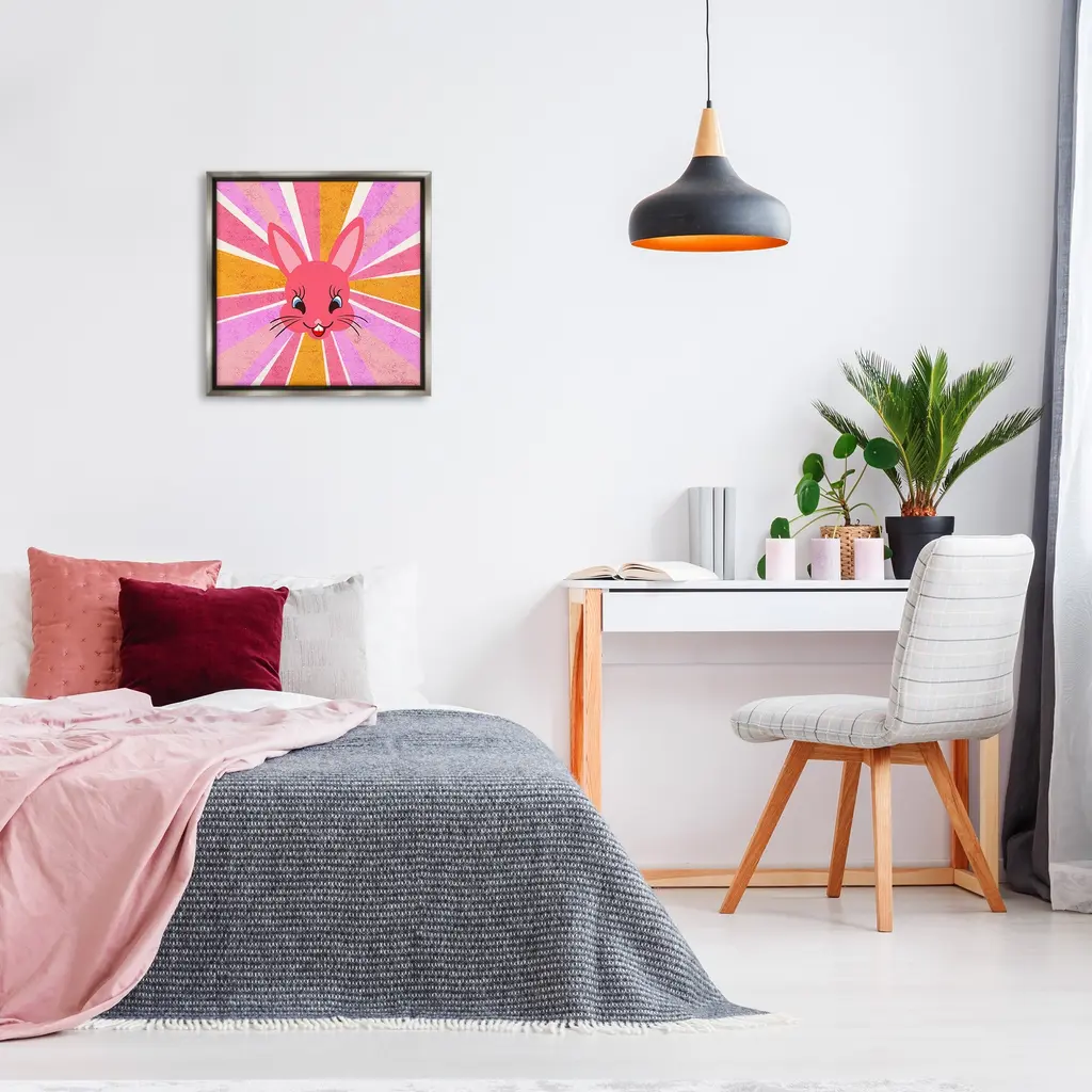 Elevate your home or office to the next level with Stupell Framed Floating Canvas Wall Art. Our premium hand-stretched canvas is mounted securely into a sturdy lightweight frame. The museum-style gap between the wrapped canvas and the box frame gives the illusion of floating artwork. Stupell Wall Art is made in the USA.Features: Dimensions: 18 x 1.7 x 18 Frame, 17 x 1.5 x 17 Canvas ArtFloating Frame Canvas Products are available in sizes 18"x18" and 25"x25". All Floating Frame Canvas Products have a 1.7" Depth.Wall Art is Ready to Hang with Hardware Free Hanging. No Installation required. For Easy Set Up Lean or Layer Artwork on Shelf or Against Wall. Artwork is Permently Fixed into the Frame.Our elevated 1.7" Thick Floating Frame is the perfect complement to our canvas style Wall Art. We use only the highest quality inks in house with industry leading printing solutions. Canvas is hand stretched over a durable wood foundation and then mounted securly into a Modern Box Frame. Made in the USA.Artwork Relates To: Cartoon, Animal, Rabbit, Bunny, Pattern, Sunburst, Abstract, ModernDesign by Carrie Cantwell