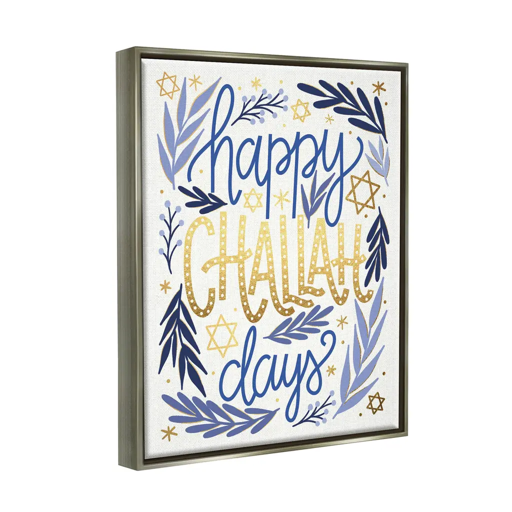 Elevate your home or office to the next level with Stupell Framed Floating Canvas Wall Art. Our premium hand stretched canvas is mounted securly into a sturdy lightweight frame. The museum style gap between wrapped canvas and box frame gives the illusion of floating artwork. Features: Dimensions: 17 x 1.7 x 21 Frame, 16 x 1.5 x 20 Canvas ArtFloating Frame Sizes Include Standard: 17 x 1.7 x 21 Oversized: 25 x 1.7 x 31Wall Art is Ready to Hang - No Installation or Hardware Needed. For Easy Set Up Lean or Layer Artwork on Shelf or Against Wall.Our elevated 1.7" Thick Floating Frame is the perfect complement to our canvas style Wall Art. We use only the highest quality inks in house with industry leading printing solutions. Canvas is hand stretched over a durable wood foundation and then mounted securly into a Modern Box Frame. Made in the USA.Artwork Relates To: Hanukkah, Star, Pattern, Botanical, HolidayDesign by Taylor Shannon DesignsLiving Room, Den, Hallway, Office, Entryway, Study, Dining Room or Bed Room.Text Includes: Happy Challah Days