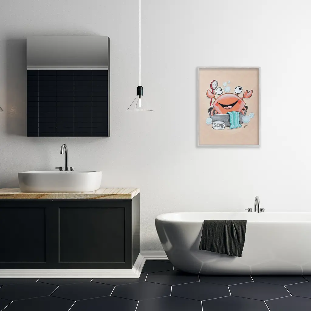 Add dimension to any room with our textured Framed Giclee Artwork. Our framed artwork is securely mounted into a 1.5-inch thick wood grain frame and ready to hang. Frames are available in three alluring styles: black, gray farmhouse and white. In addition, you should check out our oversized options if you want a statement piece. Stupell Wall Art is made in the USA.Features: Dimensions: 11 x 1.5 x 14 FramedFramed Giclee Products are available in the sizes 11"x14", 16"x20" or 24"x30". All Framed Giclee Products have a 1.5" Depth. Wall Art is Ready to Hang with Hardware Free Hanging. No installation required. For Easy Set Up Lean or Layer Artwork on Shelf or Against Wall.Our giclée prints are carefully mounted on a durable MDF backing, and then perfectly finished in a 1.5 inch thick woodgrain frame. Mounted frame colors include black, gray farmhouse and white. Made In USA.Artwork Relates To: Bathroom, Bathtub, Tub, Hygiene, Soap, Nautical, Crab, Doodle, CartoonDesign by Michelle Gilsey