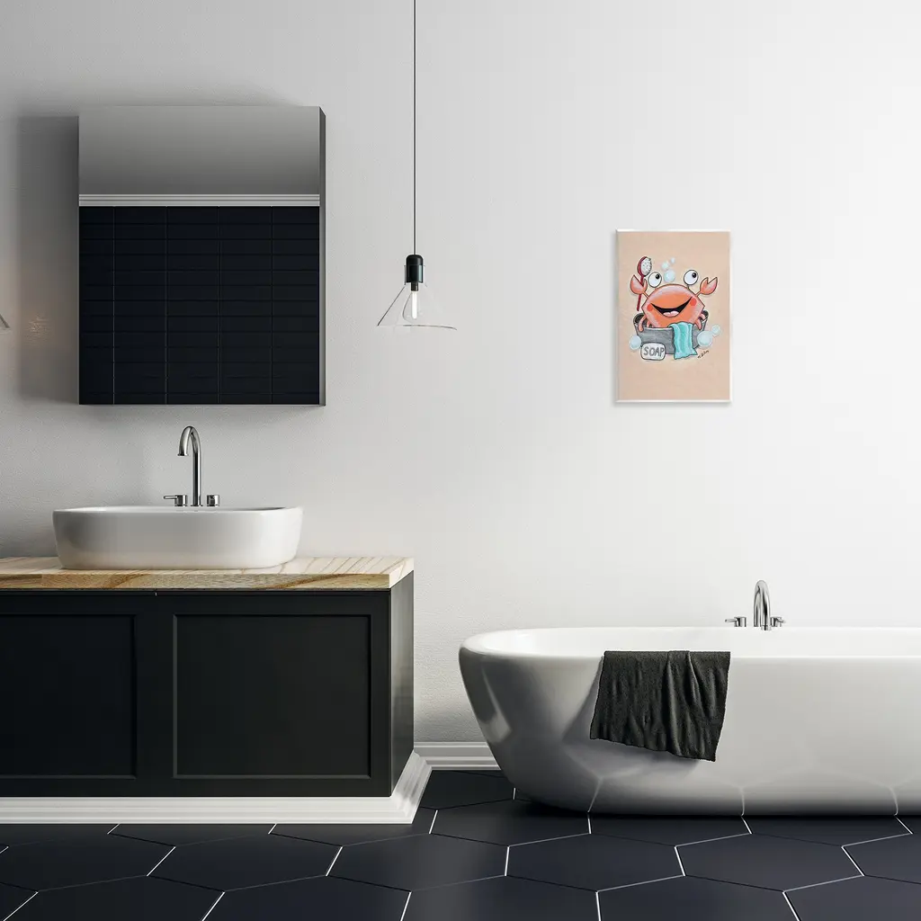 Our wall plaques start as high-quality lithograph prints mounted on durable 0.5-inch thick MDF wood. Each piece is hand finished and comes with a fresh layer of white foil on the sides to give it a crisp, clean look. Plaques arrive ready to hang without installation and come with removable plastic corners to keep them from damage in transit. Stupell Wall Art is made in the USA.Features: Dimensions: 10 x 0.5 x 15 InchesWall Plaque Product Sizes Include 10"x15" and 13"x19". All wall plaque products have a 0.5" Depth. Wall Art is Ready to Hang with Hardware Free Hanging. No installation required. For Easy Set Up Lean or Layer Artwork on Shelf or Against Wall.All of our wall plaques start off as high quality lithograph prints that are then mounted on durable 0.5 inch thick MDF wood. Each piece is hand finished and comes with a fresh layer of foil on the sides to give it a crisp clean look. Made In USA.Artwork Relates To: Bathroom, Bathtub, Tub, Hygiene, Soap, Nautical, Crab, Doodle, CartoonDesign by Michelle Gilsey