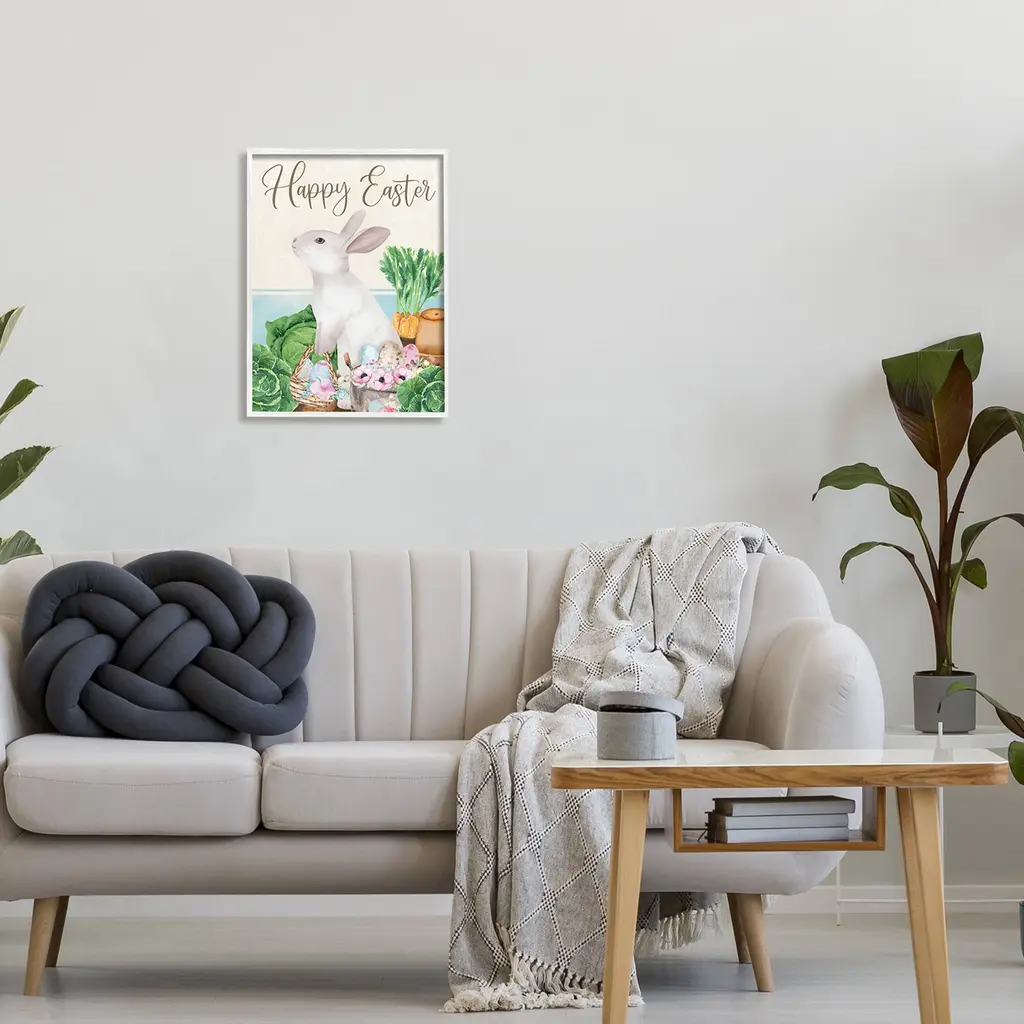 Stupell Happy Easter Bunny Rabbit Greens Eggs Basket Framed Wall Art - Green - 16 X 20 - White