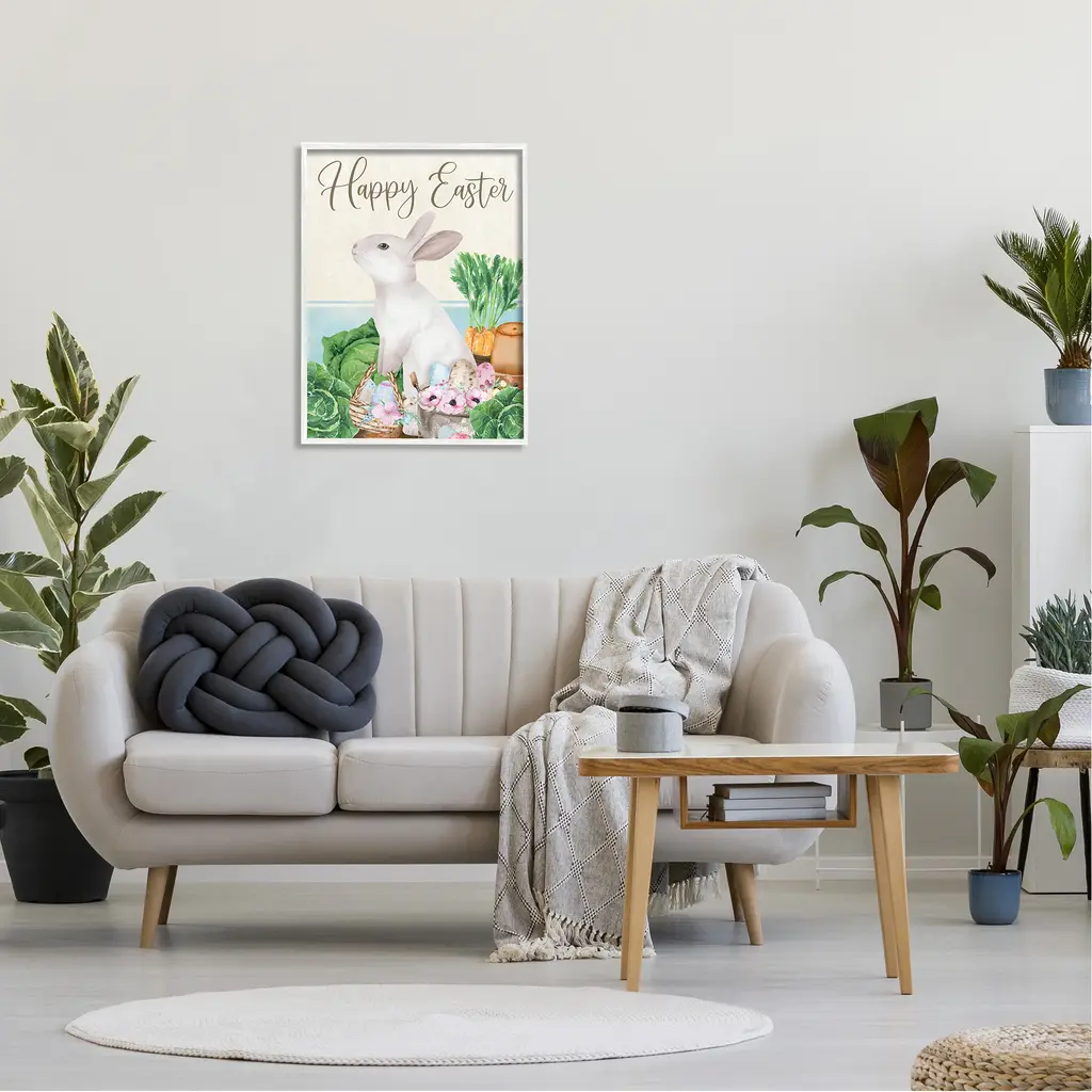 Stupell Happy Easter Bunny Rabbit Greens Eggs Basket Framed Wall Art - Green - 24 X 30 - White
