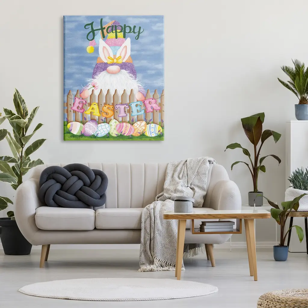 Proudly made in the USA, Our stretched canvas is created with the highest standards. We use only the highest quality inks and canvas on our in house Mimaki printers, and then hand cut and stretch each piece over a 1.5 inch thick wooden frame for hanging. The art comes ready to hang with no installation required. Room Type: Living Room, Den, Hallway, Office, Entryway, Study, Dining Room or Bedroom, Guest Room, Studio, Dorm or BoudoirFeatures: Dimensions: 16 x 1.5 x 20 InchesStretched Canvas Sizes Include Standard: 16 x 1.5 x 20 Large: 20 x 1.5 x 30 X-Large: 30 x 1.5 x 40 Oversized: 36 x 1.5 x 48Wall Art is Ready to Hang - No Installation or Hardware Needed. For Easy Set Up Lean or Layer Artwork on Shelf or Against Wall.Our stretched canvas is created with the highest standards. We use only the highest quality inks and canvas on our in house Mimaki printers, and then hand cut and stretch each piece over a 1.5 inch thick wooden frame for hanging. Made In USA.Artwork Relates To: Gnome, Easter Egg, Pattern, Spring, Easter, Happy EasterDesign by Lisa Kennedy