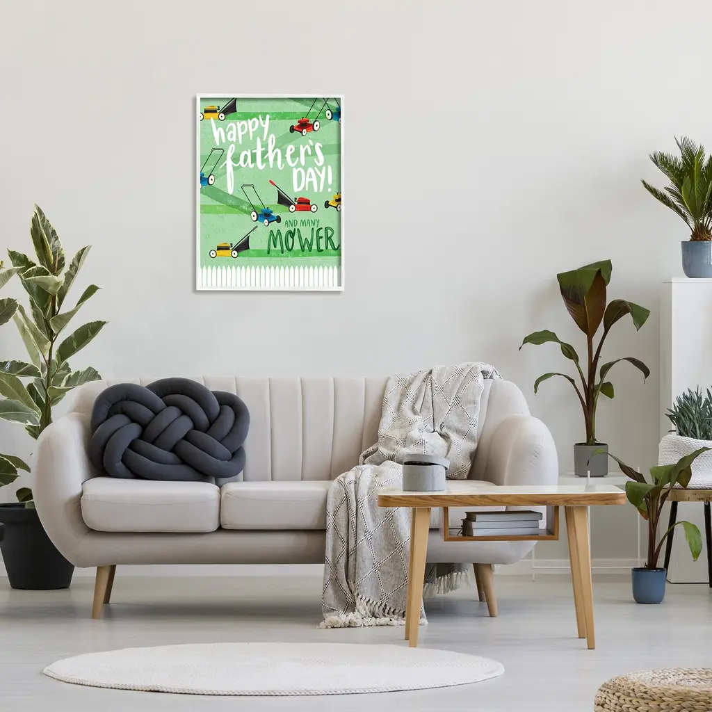 Add dimension to any room with our textured Framed Giclee Artwork. Our framed artwork is securely mounted into a 1.5-inch thick wood grain frame and ready to hang. Frames are available in three alluring styles: black, gray farmhouse and white. In addition, you should check out our oversized options if you want a statement piece. Stupell Wall Art is made in the USA.Features: Dimensions: 11 x 1.5 x 14 FramedFramed Giclee Sizes Include Standard: 11 x 1.5 x 14 Large: 16 x 1.5 x 20 Oversized: 24 x 1.5 x 30Wall Art is Ready to Hang - No Installation or Hardware Needed. For Easy Set Up Lean or Layer Artwork on Shelf or Against Wall.Our giclée prints are carefully mounted on a durable MDF backing, and then perfectly finished in a 1.5 inch thick woodgrain frame. Mounted frame colors include black, gray farmhouse and white. Made In USA.Artwork Relates To: Dad, Father's Day, Family, Lawn Mower, Humor, Happy Father's Day And Many MowerDesign by Arrolynn Weiderhold