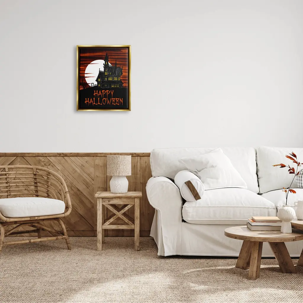 Stupell Happy Halloween Haunted House Framed Floater Canvas Wall Art, Design By The Saturday Evening Post - 17 X 21 - Gold