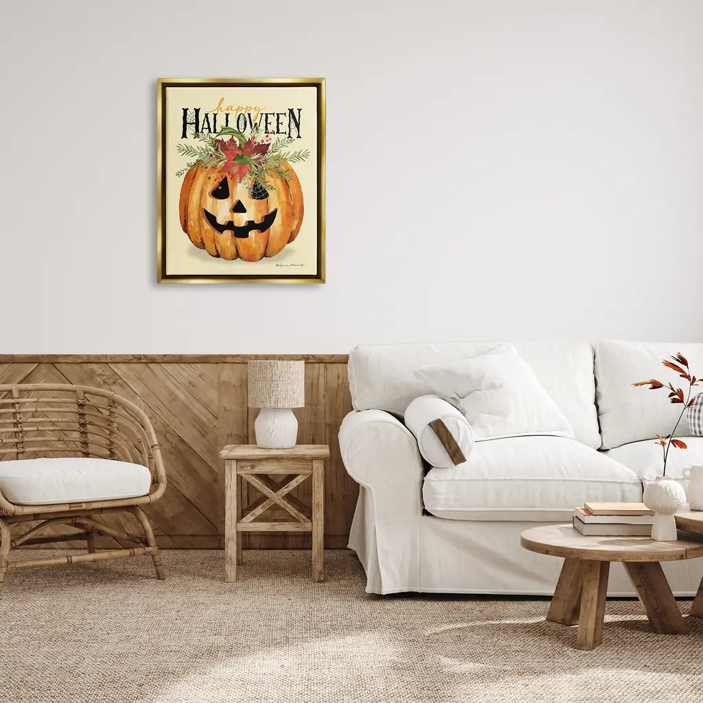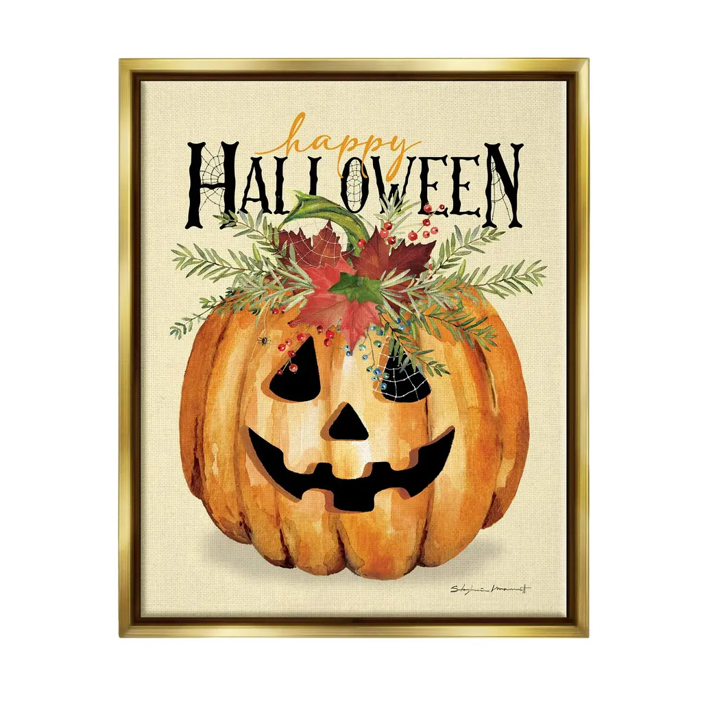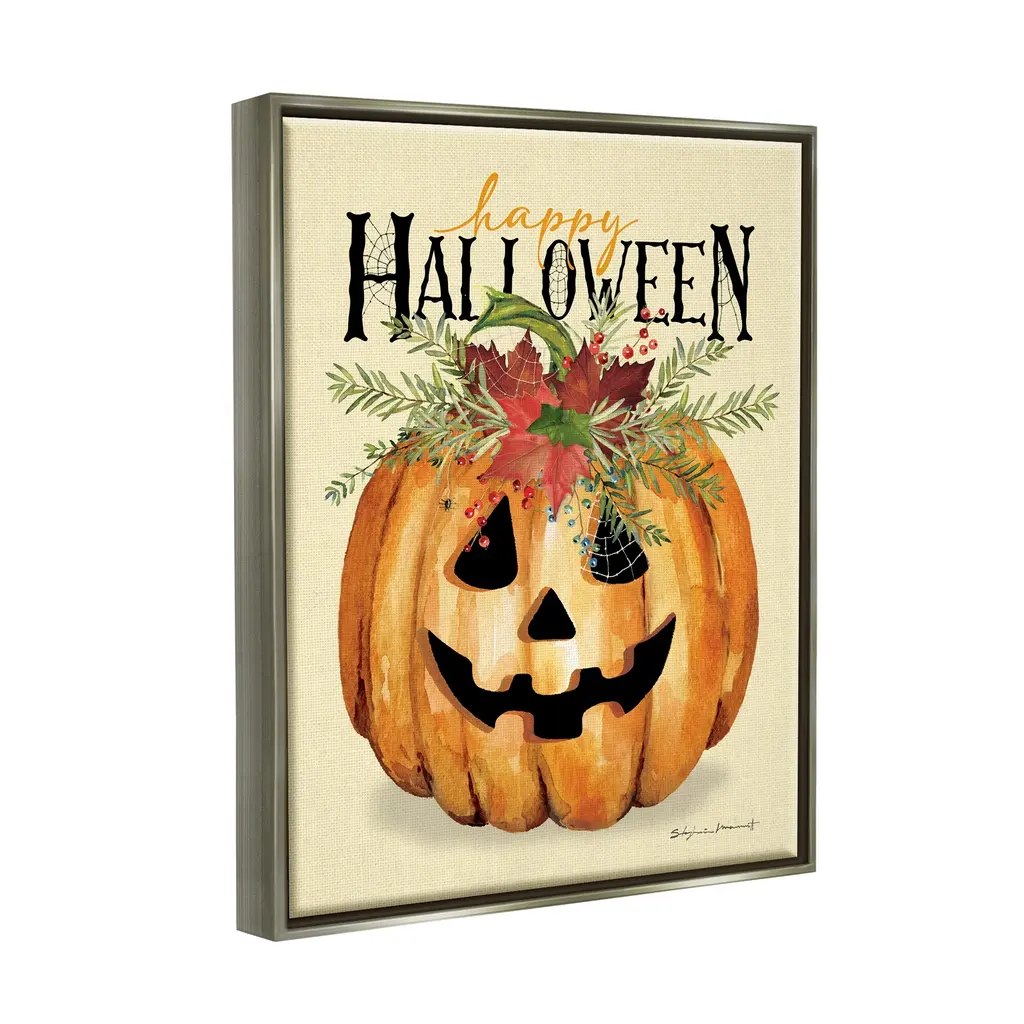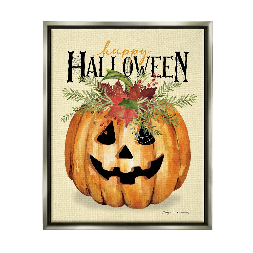 Elevate your home or office to the next level with Stupell Framed Floating Canvas Wall Art. Our premium hand-stretched canvas is mounted securely into a sturdy lightweight frame. The museum-style gap between the wrapped canvas and the box frame gives the illusion of floating artwork. Stupell Wall Art is made in the USA.Features: Dimensions: 17 x 1.7 x 21 Frame, 16 x 1.5 x 20 Canvas ArtFloating Frame Sizes Include Standard: 17 x 1.7 x 21 Oversized: 25 x 1.7 x 31Wall Art is Ready to Hang - No Installation or Hardware Needed. For Easy Set Up Lean or Layer Artwork on Shelf or Against Wall.Our elevated 1.7" Thick Floating Frame is the perfect complement to our canvas style Wall Art. We use only the highest quality inks in house with industry leading printing solutions. Canvas is hand stretched over a durable wood foundation and then mounted securly into a Modern Box Frame. Made in the USA.Artwork Relates To: Plant, Halloween, Pumpkin, Seasonal, Botanical, Jack-o-lantern, Spider Web, Happy HalloweenDesign by Stephanie Workman Marrott