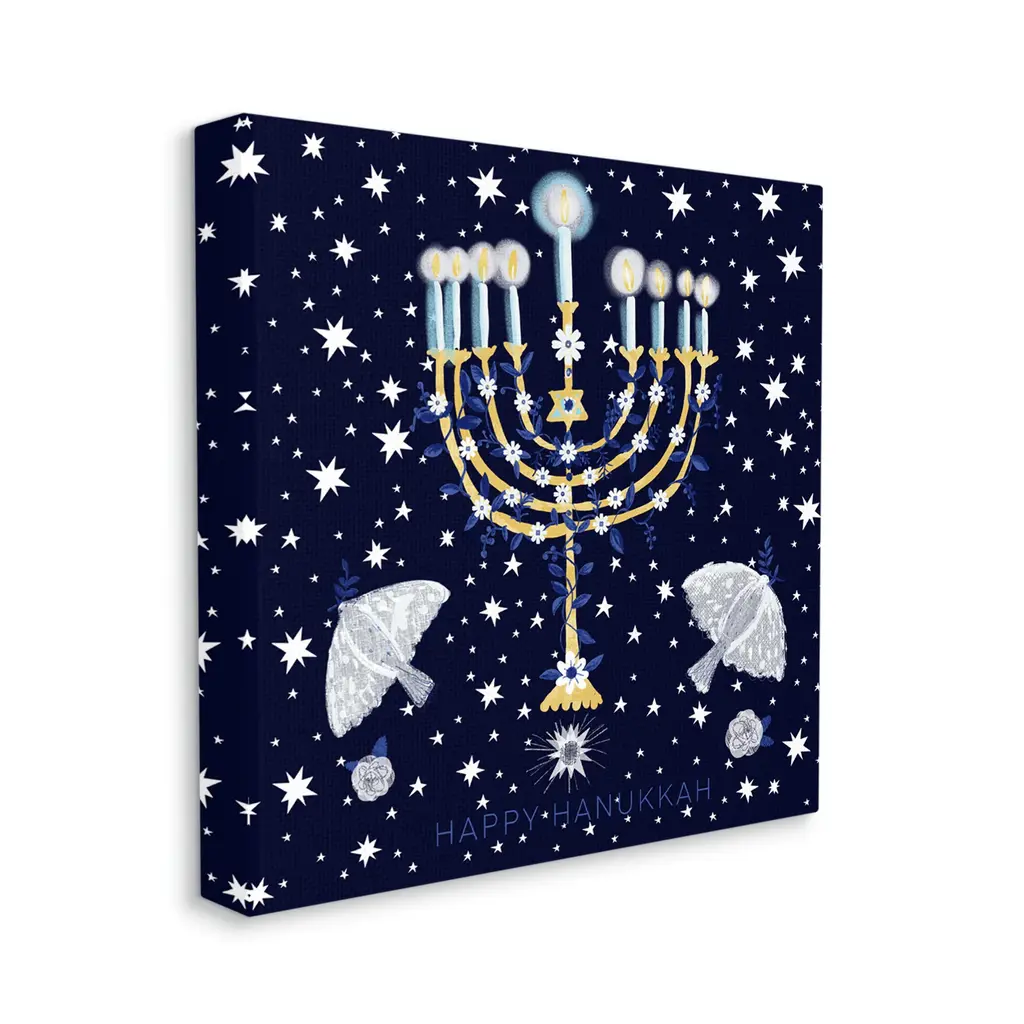 We create our stretched canvas to the highest standards. Using only the highest quality inks and canvas on Mimaki printers, we hand-cut and stretch each piece over a 1.5-inch thick wooden frame for hanging. As a result, the art comes ready to hang on the sturdy ledge with no installation required. Stupell Wall Art is made in the USA.Features: Dimensions: 17 x 1.5 x 17 InchesStretched Canvas Sizes Include Standard: 17 x 1.5 x 17 Large: 24 x 1.5 x 24 X-Large: 30 x 1.5 x 30 Oversized: 36 x 1.5 x 36Wall Art is Ready to Hang - No Installation or Hardware Needed. For Easy Set Up Lean or Layer Artwork on Shelf or Against Wall.Our stretched canvas is created with the highest standards. We use only the highest quality inks and canvas on our in house Mimaki printers, and then hand cut and stretch each piece over a 1.5 inch thick wooden frame for hanging. Made In USA.Artwork Relates To: Festival, Hanukkah Menorah, Candle, Dove, Happy HanukkahDesign by Susse Linton
