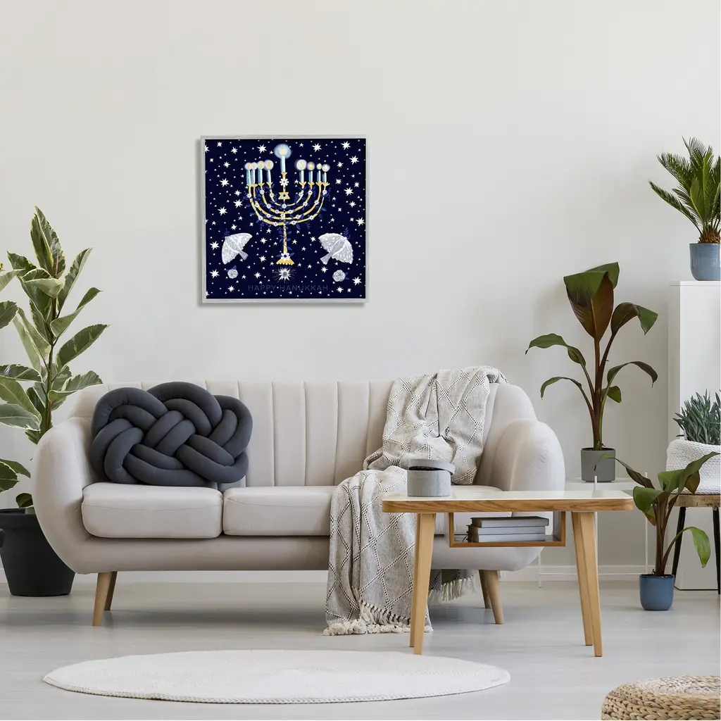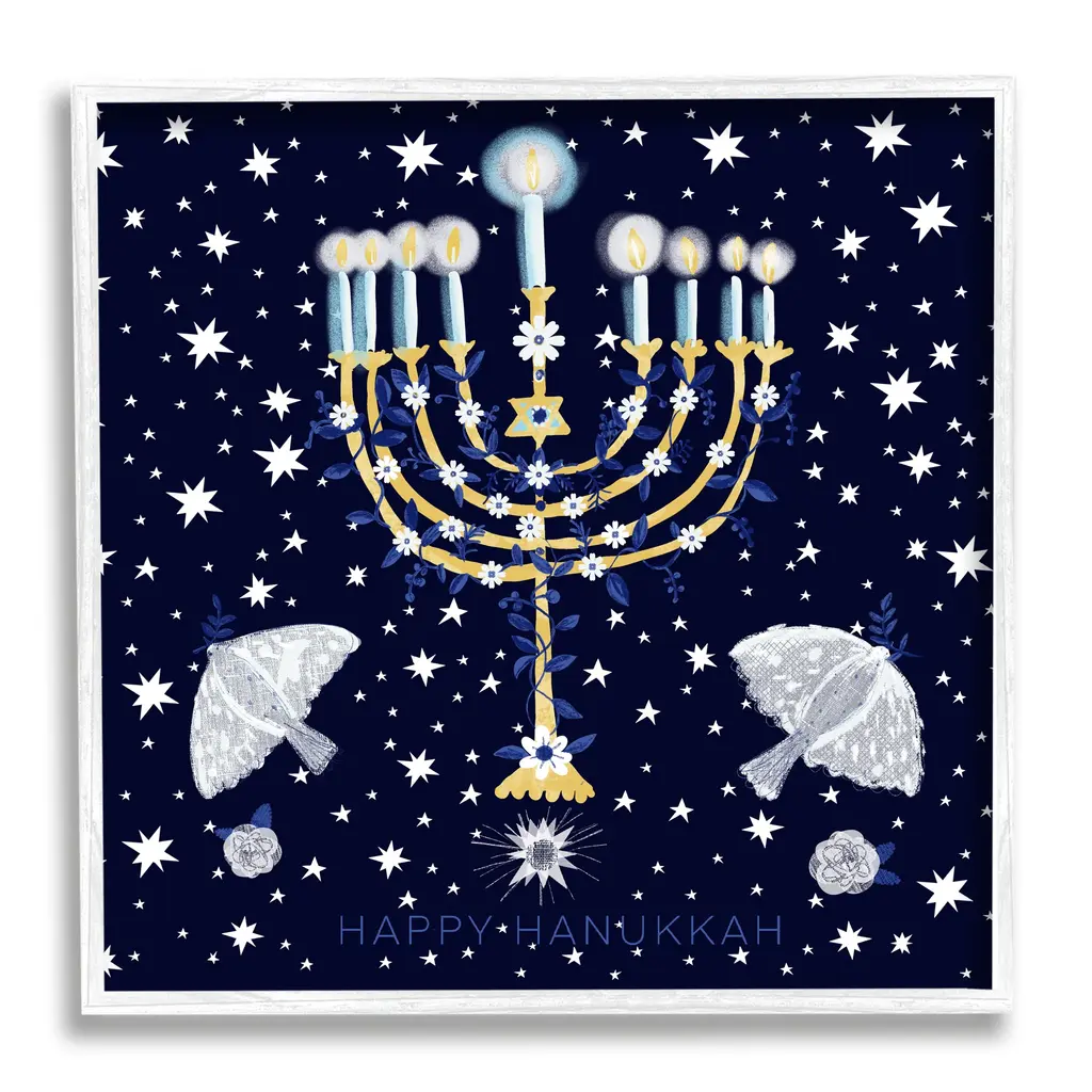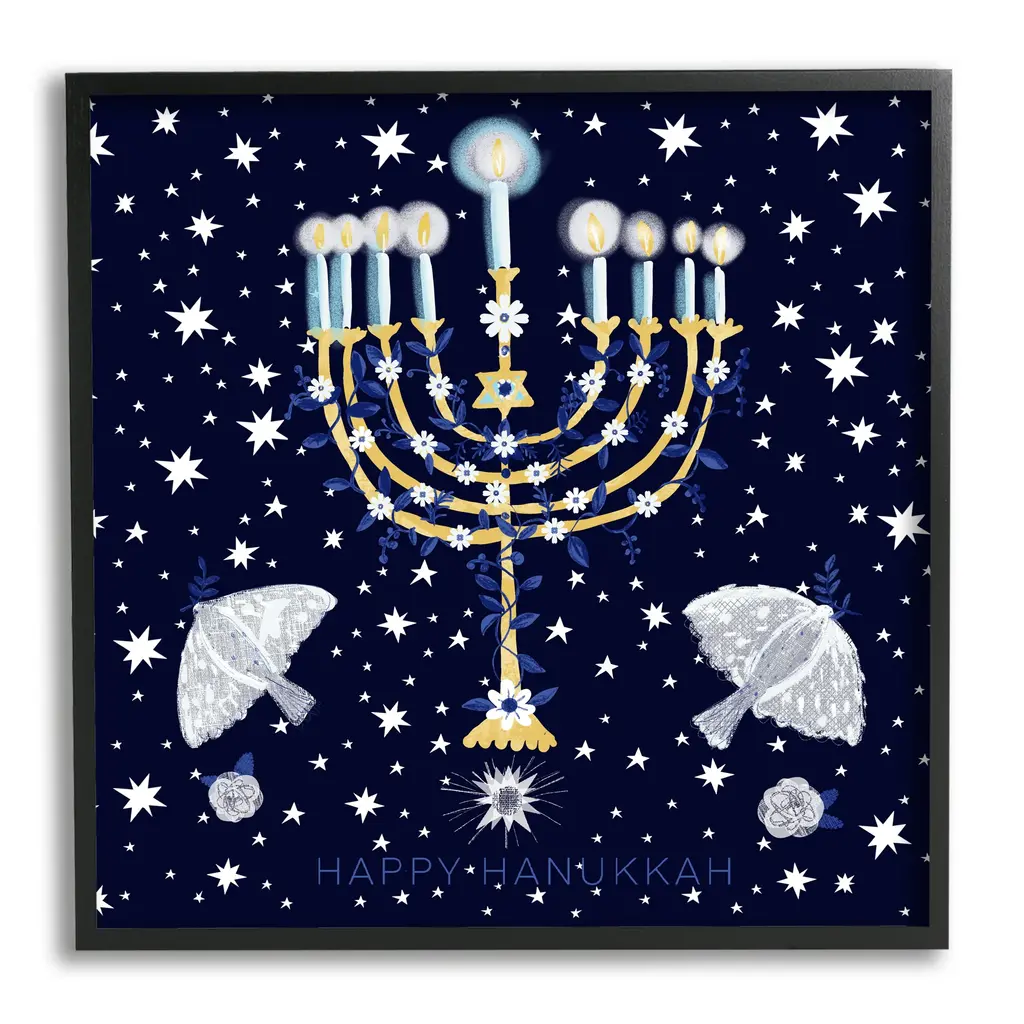 Add dimension to any room with our textured Framed Giclee Artwork. Our framed artwork is securely mounted into a 1.5-inch thick wood grain frame and ready to hang. Frames are available in three alluring styles: black, gray farmhouse and white. In addition, you should check out our oversized options if you want a statement piece. Stupell Wall Art is made in the USA.Features: Dimensions: 12 x 1.5 x 12 FramedFramed Giclee Sizes Include Standard: 12 x 1.5 x 12 Large: 17 x 1.5 x 17 Oversized: 24 x 1.5 x 24Wall Art is Ready to Hang - No Installation or Hardware Needed. For Easy Set Up Lean or Layer Artwork on Shelf or Against Wall.Our giclée prints are carefully mounted on a durable MDF backing, and then perfectly finished in a 1.5 inch thick woodgrain frame. Mounted frame colors include black, gray farmhouse and white. Made In USA.Artwork Relates To: Festival, Hanukkah Menorah, Candle, Dove, Happy HanukkahDesign by Susse Linton