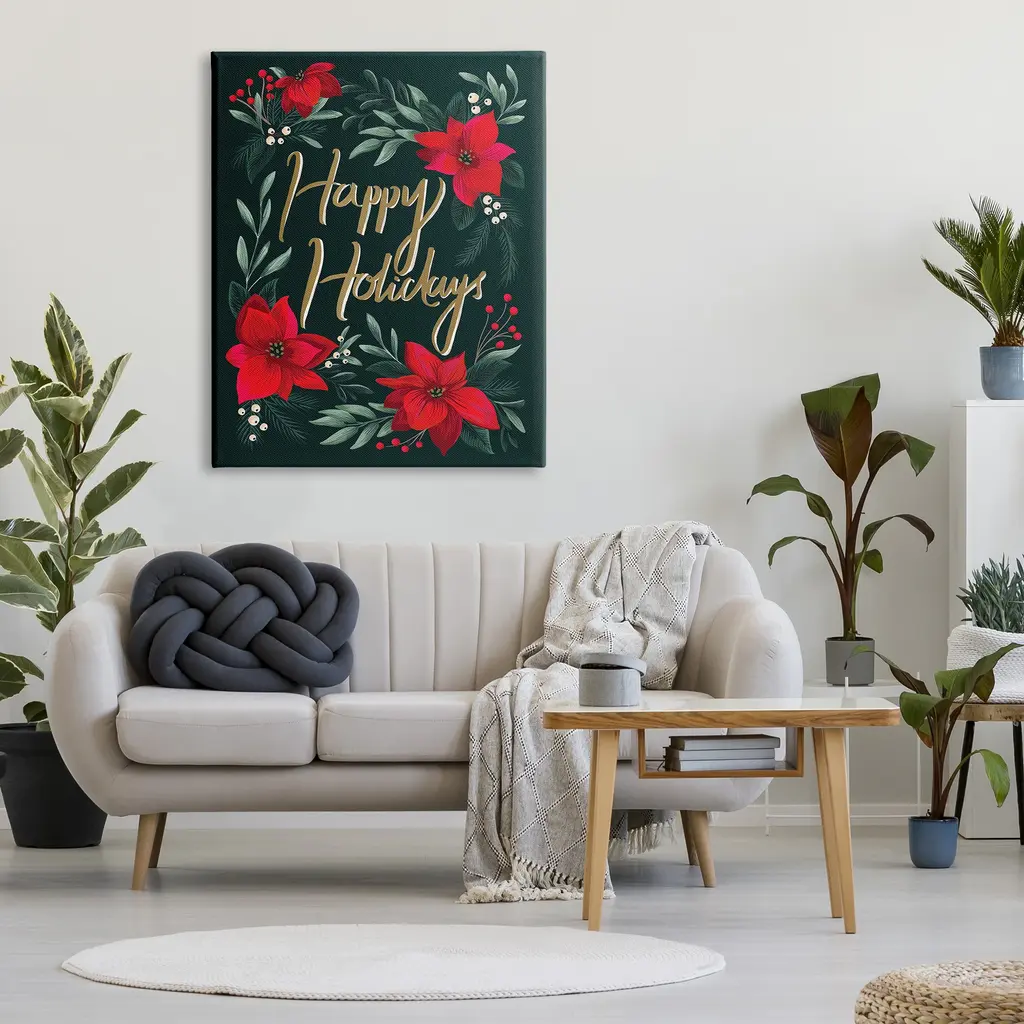 Stupell Happy Holidays Greeting Red Winter Poinsettia Florals Canvas Wall Art - 36 X 48