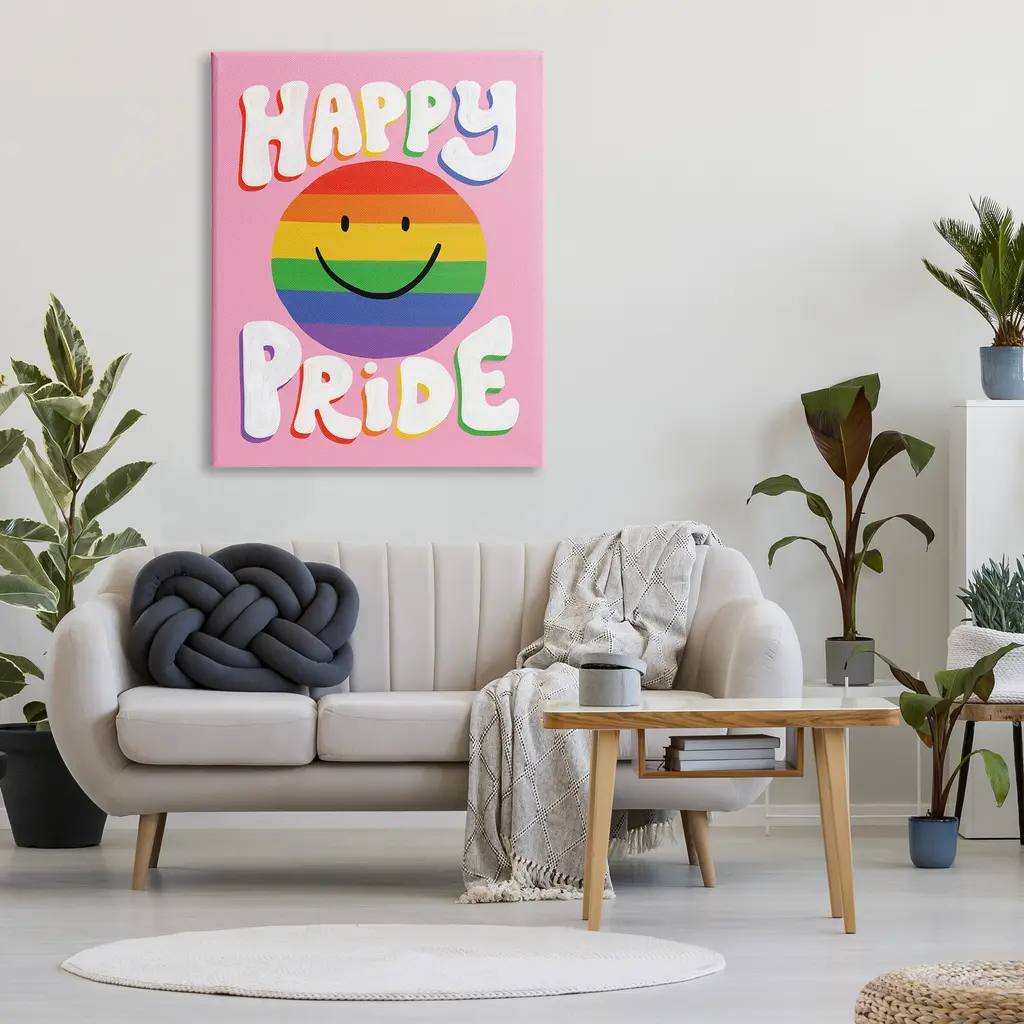 We create our stretched canvas to the highest standards. Using only the highest quality inks and canvas on Mimaki printers, we hand-cut and stretch each piece over a 1.5-inch thick wooden frame for hanging. As a result, the art comes ready to hang on the sturdy ledge with no installation required. Stupell Wall Art is made in the USA.Features: Dimensions: 16 x 1.5 x 20 InchesStretched Canvas Sizes Include Standard: 16 x 1.5 x 20 Large: 20 x 1.5 x 30 X-Large: 30 x 1.5 x 40 Oversized: 36 x 1.5 x 48Wall Art is Ready to Hang - No Installation or Hardware Needed. For Easy Set Up Lean or Layer Artwork on Shelf or Against Wall.Our stretched canvas is created with the highest standards. We use only the highest quality inks and canvas on our in house Mimaki printers, and then hand cut and stretch each piece over a 1.5 inch thick wooden frame for hanging. Made In USA.Artwork Relates To: Rainbow, Smiley Face, LGBTQ, Happy PrideDesign by Deborah Curiel