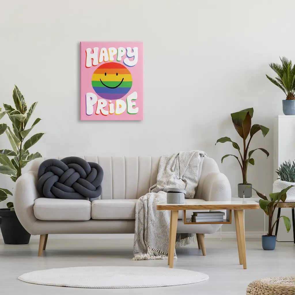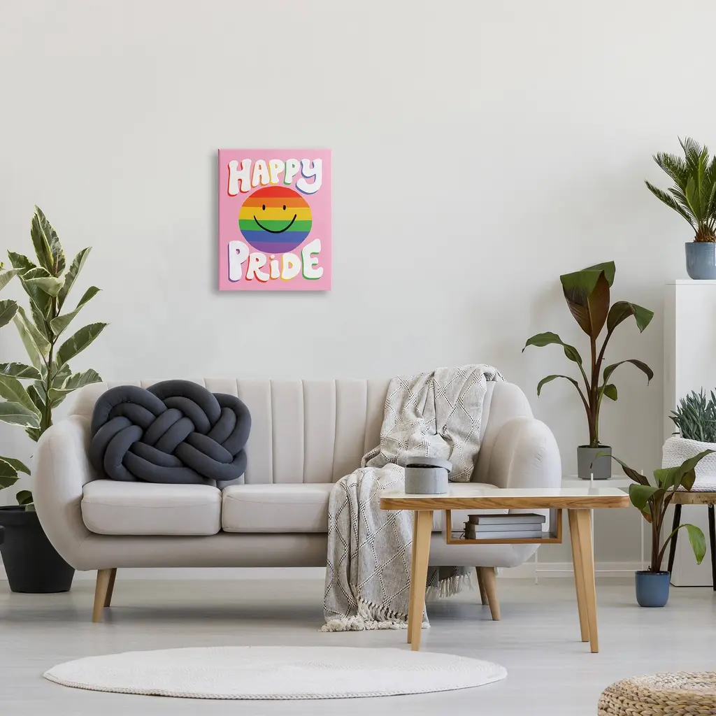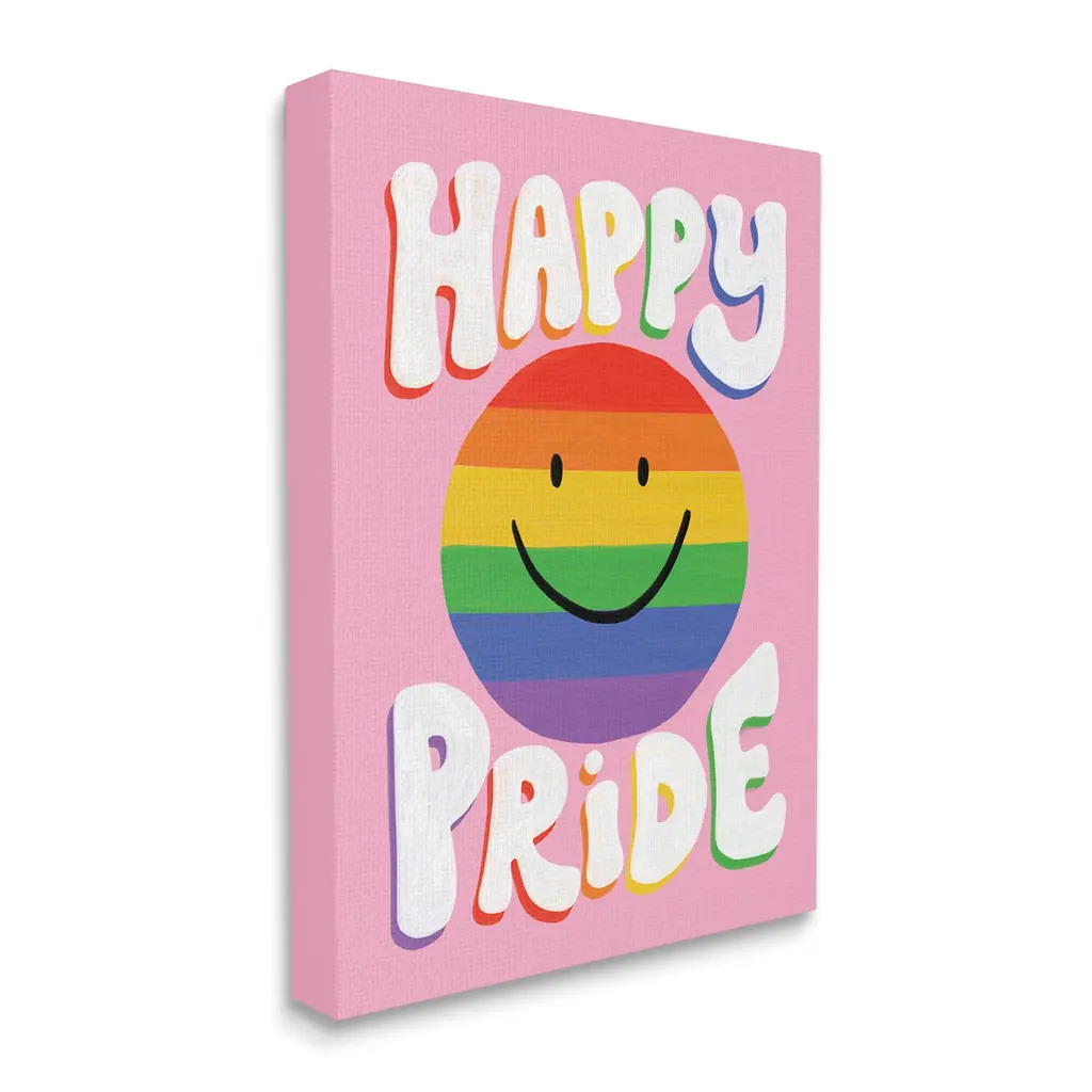 We create our stretched canvas to the highest standards. Using only the highest quality inks and canvas on Mimaki printers, we hand-cut and stretch each piece over a 1.5-inch thick wooden frame for hanging. As a result, the art comes ready to hang on the sturdy ledge with no installation required. Stupell Wall Art is made in the USA.Features: Dimensions: 16 x 1.5 x 20 InchesStretched Canvas Sizes Include Standard: 16 x 1.5 x 20 Large: 20 x 1.5 x 30 X-Large: 30 x 1.5 x 40 Oversized: 36 x 1.5 x 48Wall Art is Ready to Hang - No Installation or Hardware Needed. For Easy Set Up Lean or Layer Artwork on Shelf or Against Wall.Our stretched canvas is created with the highest standards. We use only the highest quality inks and canvas on our in house Mimaki printers, and then hand cut and stretch each piece over a 1.5 inch thick wooden frame for hanging. Made In USA.Artwork Relates To: Rainbow, Smiley Face, LGBTQ, Happy PrideDesign by Deborah Curiel