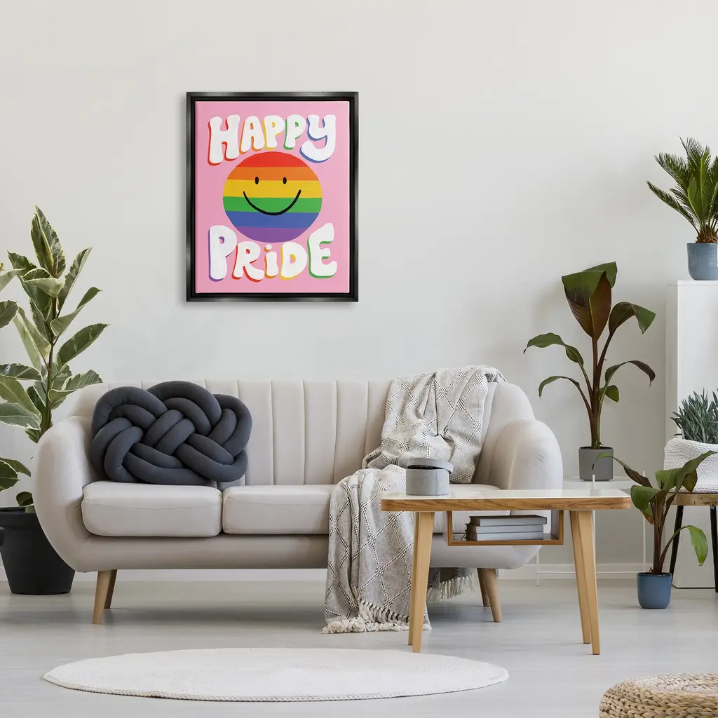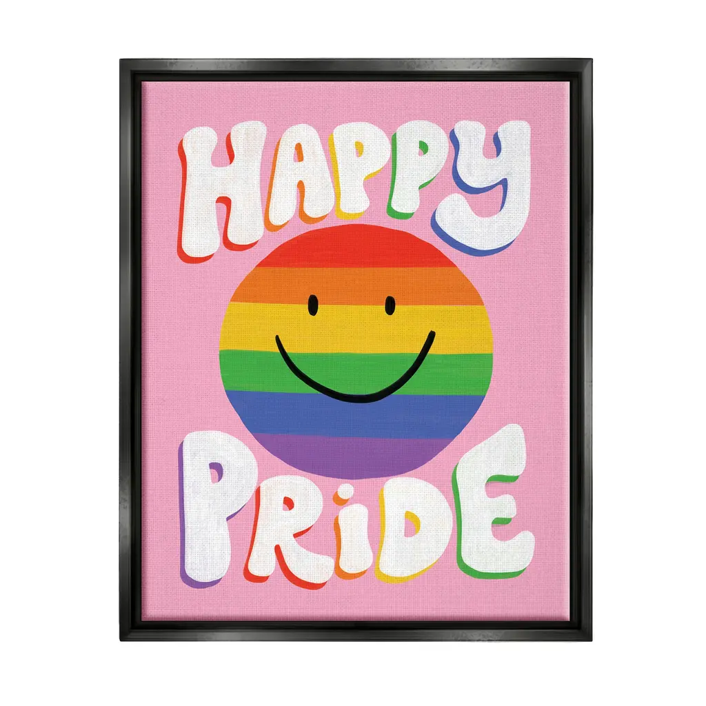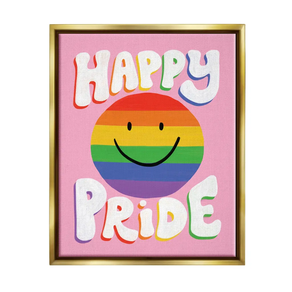 Elevate your home or office to the next level with Stupell Framed Floating Canvas Wall Art. Our premium hand-stretched canvas is mounted securely into a sturdy lightweight frame. The museum-style gap between the wrapped canvas and the box frame gives the illusion of floating artwork. Stupell Wall Art is made in the USA.Features: Dimensions: 17 x 1.7 x 21 Frame, 16 x 1.5 x 20 Canvas ArtFloating Frame Sizes Include Standard: 17 x 1.7 x 21 Oversized: 25 x 1.7 x 31Wall Art is Ready to Hang - No Installation or Hardware Needed. For Easy Set Up Lean or Layer Artwork on Shelf or Against Wall.Our elevated 1.7" Thick Floating Frame is the perfect complement to our canvas style Wall Art. We use only the highest quality inks in house with industry leading printing solutions. Canvas is hand stretched over a durable wood foundation and then mounted securly into a Modern Box Frame. Made in the USA.Artwork Relates To: Rainbow, Smiley Face, LGBTQ, Happy PrideDesign by Deborah Curiel