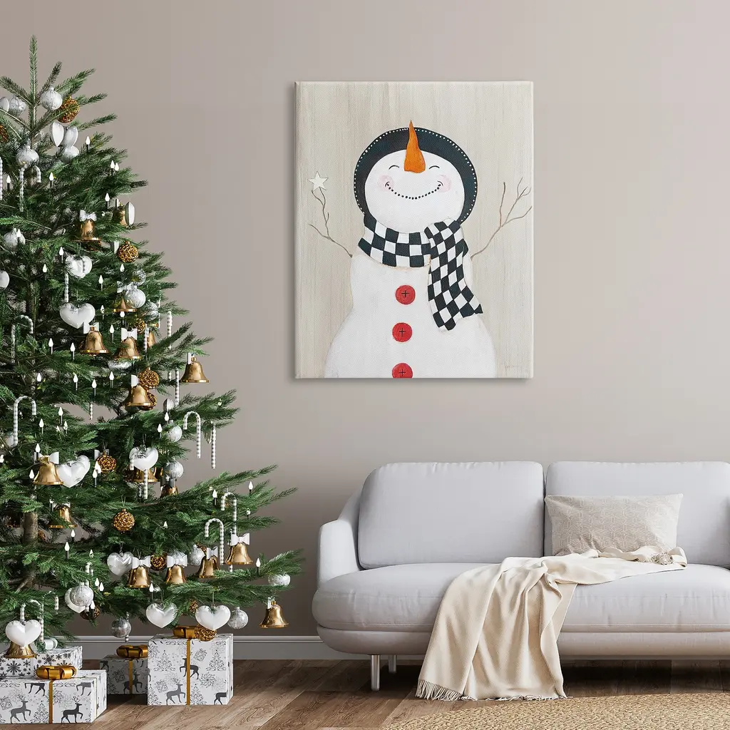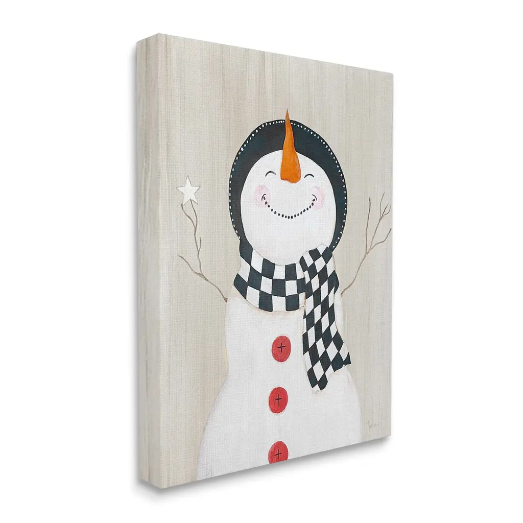 We create our stretched canvas to the highest standards. Using only the highest quality inks and canvas on Mimaki printers, we hand-cut and stretch each piece over a 1.5-inch thick wooden frame for hanging. As a result, the art comes ready to hang on the sturdy ledge with no installation required. Stupell Wall Art is made in the USA.Features: Dimensions: 16 x 1.5 x 20 InchesStretched Canvas Sizes Include Standard: 16 x 1.5 x 20 Large: 20 x 1.5 x 30 X-Large: 30 x 1.5 x 40 Oversized: 36 x 1.5 x 48Wall Art is Ready to Hang - No Installation or Hardware Needed. For Easy Set Up Lean or Layer Artwork on Shelf or Against Wall.Our stretched canvas is created with the highest standards. We use only the highest quality inks and canvas on our in house Mimaki printers, and then hand cut and stretch each piece over a 1.5 inch thick wooden frame for hanging. Made In USA.Artwork Relates To: Snowman, Winter, Seasonal, Snow, HolidayDesign by Janet Tava