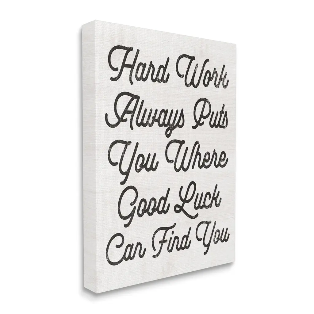 We create our stretched canvas to the highest standards. Using only the highest quality inks and canvas on Mimaki printers, we hand-cut and stretch each piece over a 1.5-inch thick wooden frame for hanging. As a result, the art comes ready to hang on the sturdy ledge with no installation required. Stupell Wall Art is made in the USA.Features: Dimensions: 16 x 1.5 x 20 InchesStretched Canvas Sizes Include Standard: 16 x 1.5 x 20 Large: 20 x 1.5 x 30 X-Large: 30 x 1.5 x 40 Oversized: 36 x 1.5 x 48Wall Art is Ready to Hang - No Installation or Hardware Needed. For Easy Set Up Lean or Layer Artwork on Shelf or Against Wall.Our stretched canvas is created with the highest standards. We use only the highest quality inks and canvas on our in house Mimaki printers, and then hand cut and stretch each piece over a 1.5 inch thick wooden frame for hanging. Made In USA.Artwork Relates To: Phrase, Inspirational, Motivational, Hard Work Always Puts You Where Good Luck Can Find YouDesign by Lil' Rue