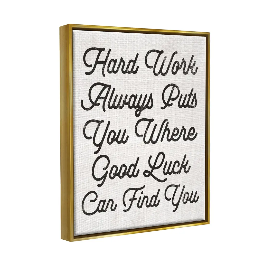 Elevate your home or office to the next level with Stupell Framed Floating Canvas Wall Art. Our premium hand-stretched canvas is mounted securely into a sturdy lightweight frame. The museum-style gap between the wrapped canvas and the box frame gives the illusion of floating artwork. Stupell Wall Art is made in the USA.Features: Dimensions: 17 x 1.7 x 21 Frame, 16 x 1.5 x 20 Canvas ArtFloating Frame Sizes Include Standard: 17 x 1.7 x 21 Oversized: 25 x 1.7 x 31Wall Art is Ready to Hang - No Installation or Hardware Needed. For Easy Set Up Lean or Layer Artwork on Shelf or Against Wall.Our elevated 1.7" Thick Floating Frame is the perfect complement to our canvas style Wall Art. We use only the highest quality inks in house with industry leading printing solutions. Canvas is hand stretched over a durable wood foundation and then mounted securly into a Modern Box Frame. Made in the USA.Artwork Relates To: Phrase, Inspirational, Motivational, Hard Work Always Puts You Where Good Luck Can Find YouDesign by Lil' Rue