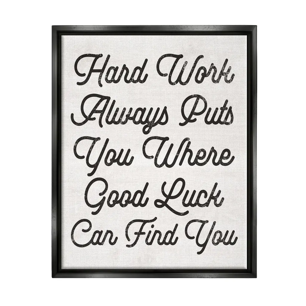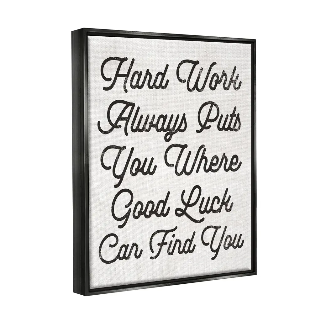 Elevate your home or office to the next level with Stupell Framed Floating Canvas Wall Art. Our premium hand-stretched canvas is mounted securely into a sturdy lightweight frame. The museum-style gap between the wrapped canvas and the box frame gives the illusion of floating artwork. Stupell Wall Art is made in the USA.Features: Dimensions: 17 x 1.7 x 21 Frame, 16 x 1.5 x 20 Canvas ArtFloating Frame Sizes Include Standard: 17 x 1.7 x 21 Oversized: 25 x 1.7 x 31Wall Art is Ready to Hang - No Installation or Hardware Needed. For Easy Set Up Lean or Layer Artwork on Shelf or Against Wall.Our elevated 1.7" Thick Floating Frame is the perfect complement to our canvas style Wall Art. We use only the highest quality inks in house with industry leading printing solutions. Canvas is hand stretched over a durable wood foundation and then mounted securly into a Modern Box Frame. Made in the USA.Artwork Relates To: Phrase, Inspirational, Motivational, Hard Work Always Puts You Where Good Luck Can Find YouDesign by Lil' Rue